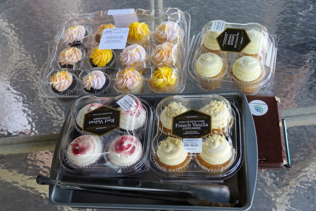 [Birthday cupcakes at our Alexandria Golf Club Wednesday fine dining night. The Super brought them for Ken Esala and me (joint birthdays on the 4th) to share with the cast of several . . . ]