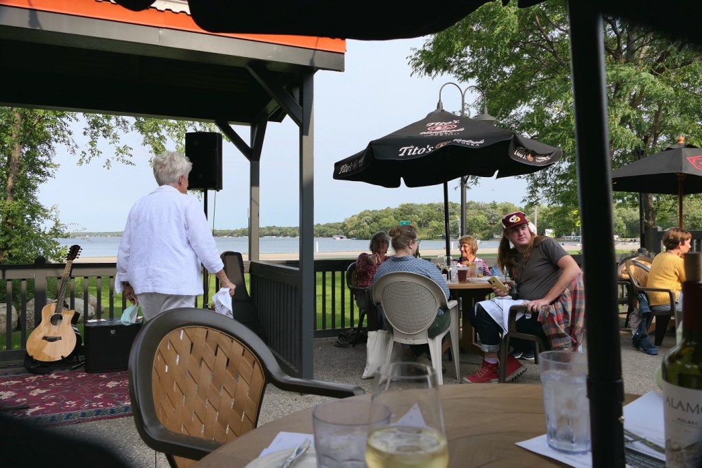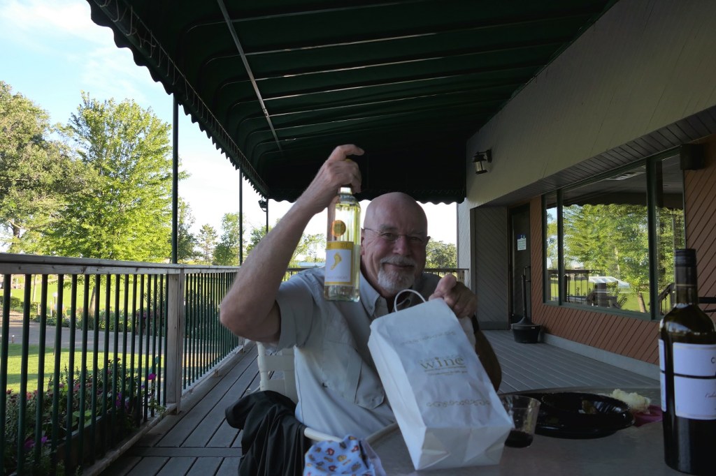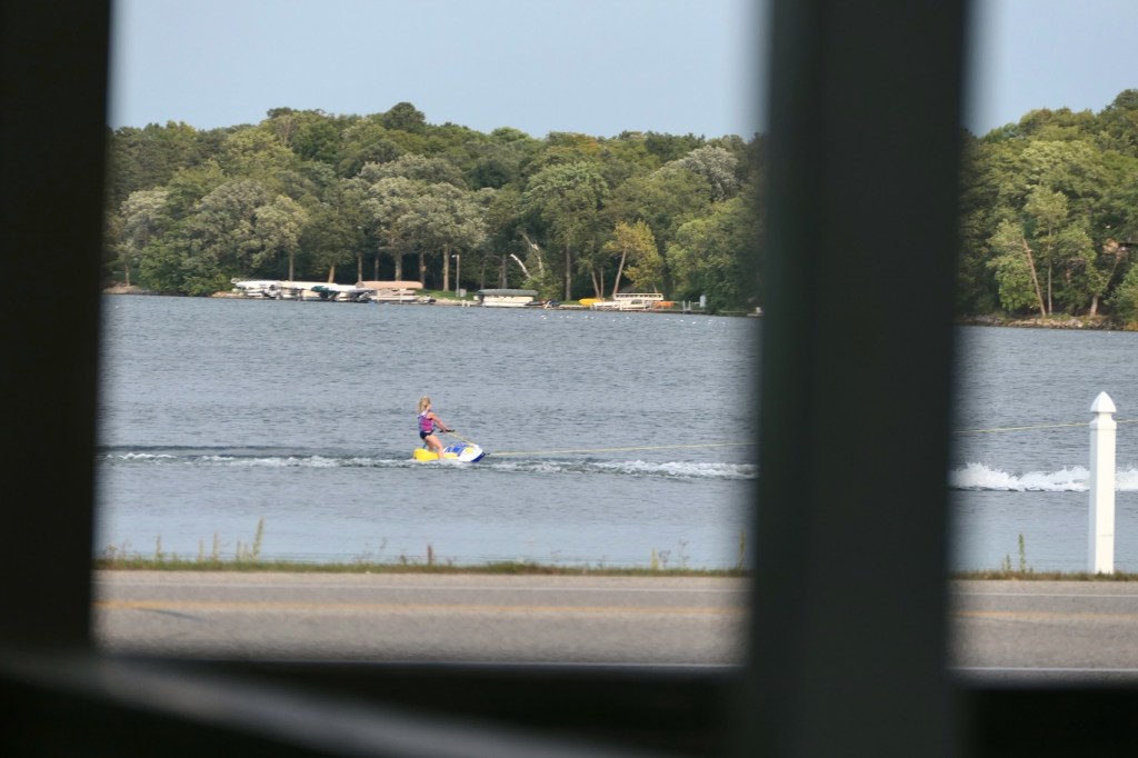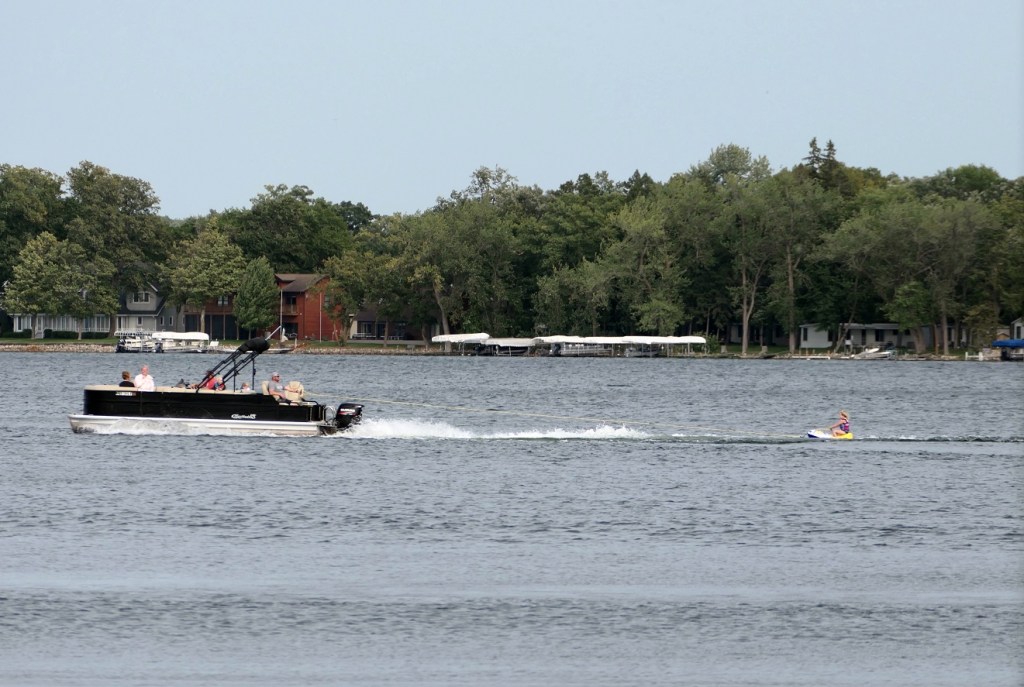 [Background entertainment on Lake Le Homme Dieu. A very young lady was waterskiing – I guessed she was 3, Karin said 7. She’s likely right . . . ]