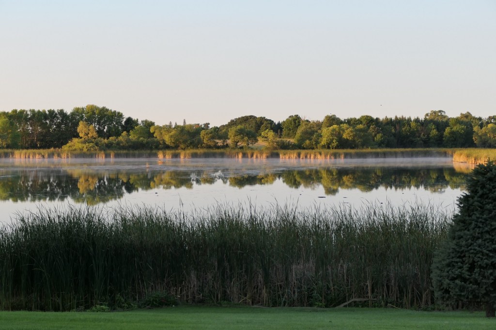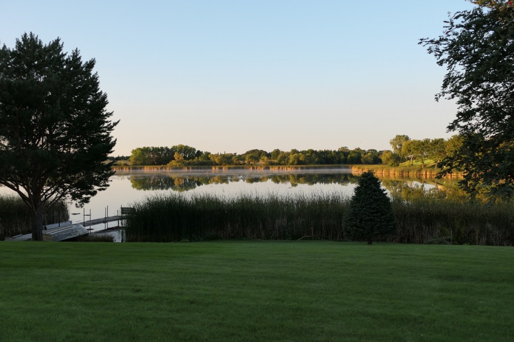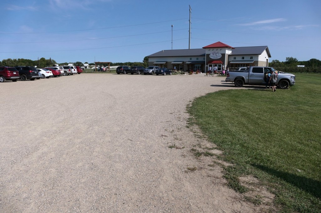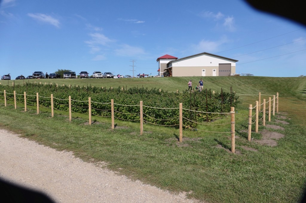 [A road trip of a mere 8 miles from home. Nevertheless, we almost lost our lives twice on the way! On the main highway, a pickup truck towing a boat was upset we were only going the speed limit and passed us as we were making a right turn. But a truck was making a right hand turn entering the highway, had to swerve to the shoulder to miss the boat guy, horns blaring all around. Then we were on a dirt road to the farm and came to an intersection, a car coming from the left had stopped at a stop sign, then took off right in front of us apparently thinking we had a stop sign too – we didn’t. Uff da!]