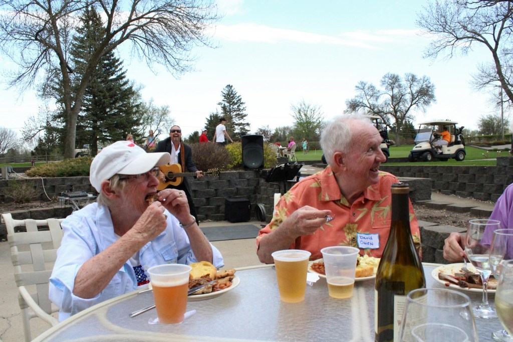 Friday night was a Let’s Celebrate Golf Season shindig at the golf club with chicken, ribs, and fixin’s, with Mary and Crazy Dave fresh from Sarasota . . . and with BAT. BAT sang for both of them for their recent birthdays. Mary said, “Pass the ribs, please.” Crazy said, “I only have a beer and a half in front of me?”