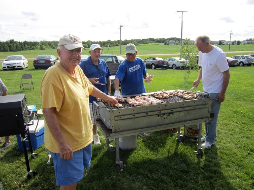 Alexandria braced itself today (July 16) for what annually has become the largest eating fest ever this side of Stearns County. Shalom Lutheran Church sponsors a pork chop and chicken bar-b-q, with all the fixin’s, that usually takes place in 95-degree temps with 75-degree dewpoints. We have a weather reprieve this year. Possibly because of that, turnout seemed larger than ever this year. Several 747’s full of Japanese tourists landed at Chandler Field this afternoon, creating parking mayhem from Villard to Urbank. The super and I had pre-paid tickets, but nevertheless we had to stand in a line that stretched all the way to Elden’s. Once inside the church we were given a number and told to wait in the sanctuary. Once inside the sanctuary, we were told it would be a two-month wait in the SRO crowd before our number would be called. Fearing a panic attack, or even worse a hunger pang, the supervisor bolted forward asking if we had to wait if we wanted take-out? We did not – we were saved! Here Crazy Dave supervises the hordes of volunteer grill operators – to which all I can say is, better him than me!