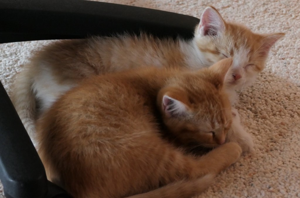 [Guinevere is mostly all ginger, and Galahad has white splotches and mostly white front legs. My shoe is mostly white, though totally defeated . . . ]
