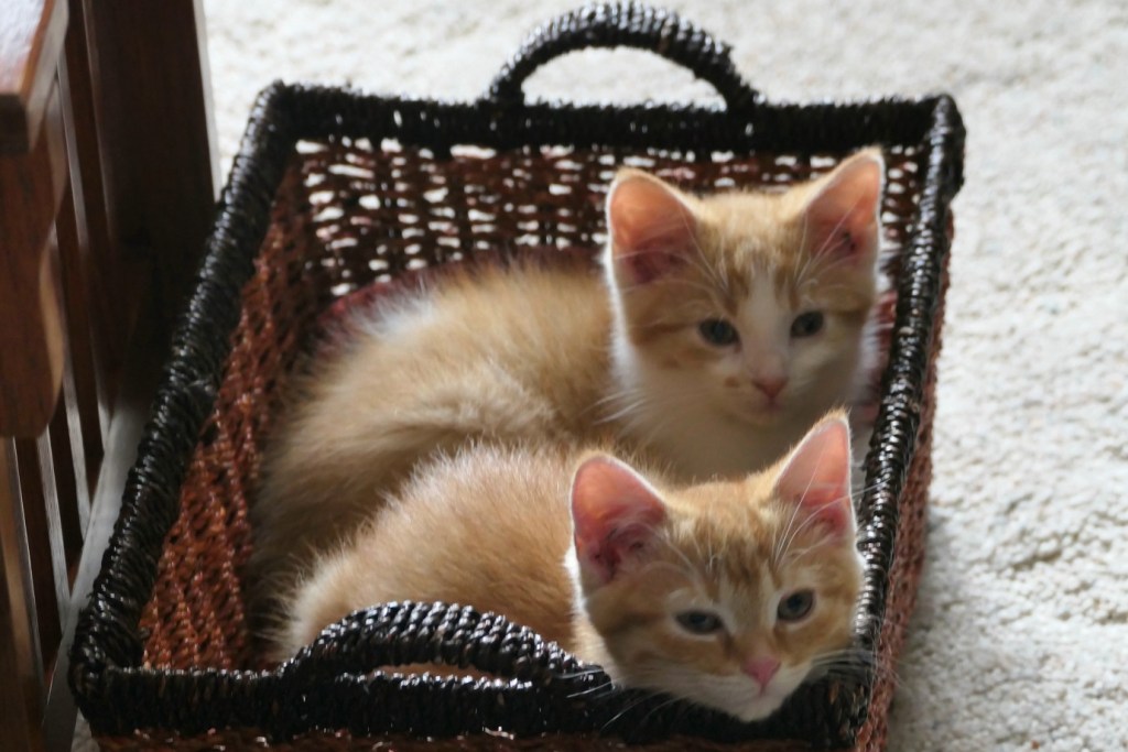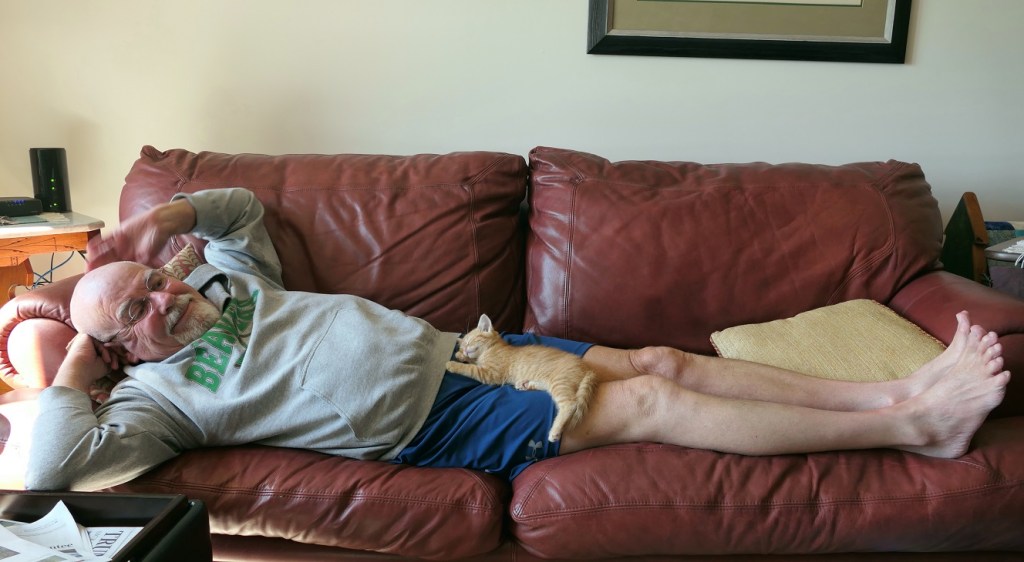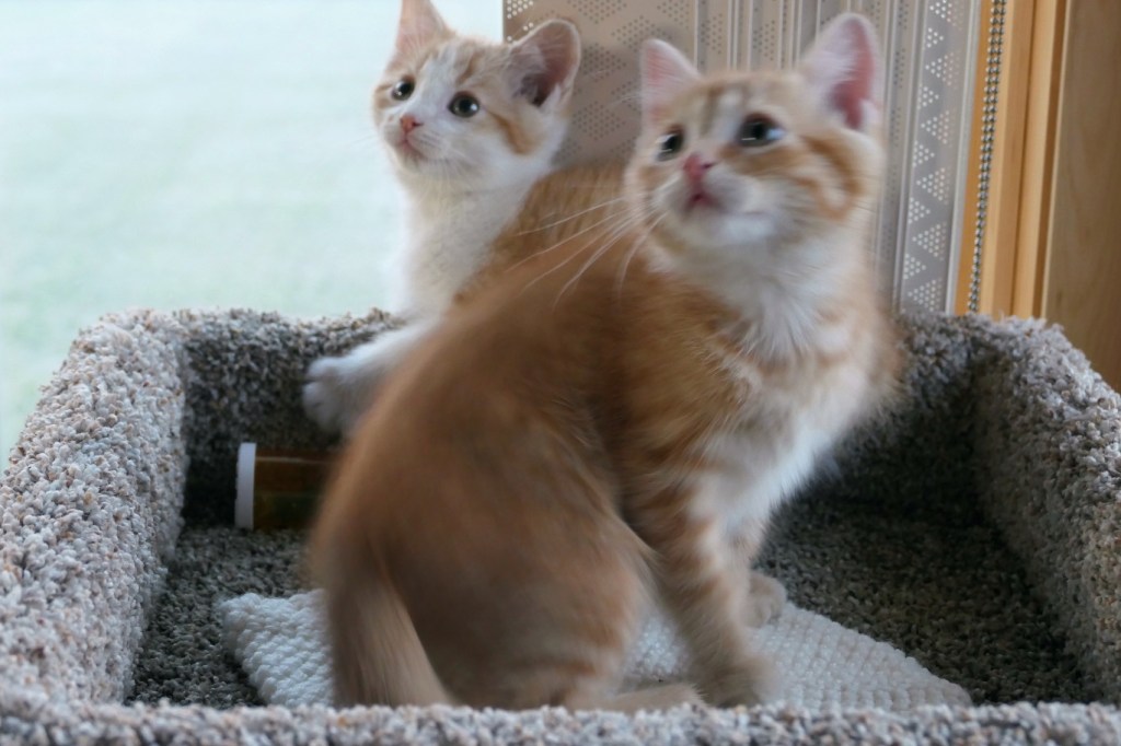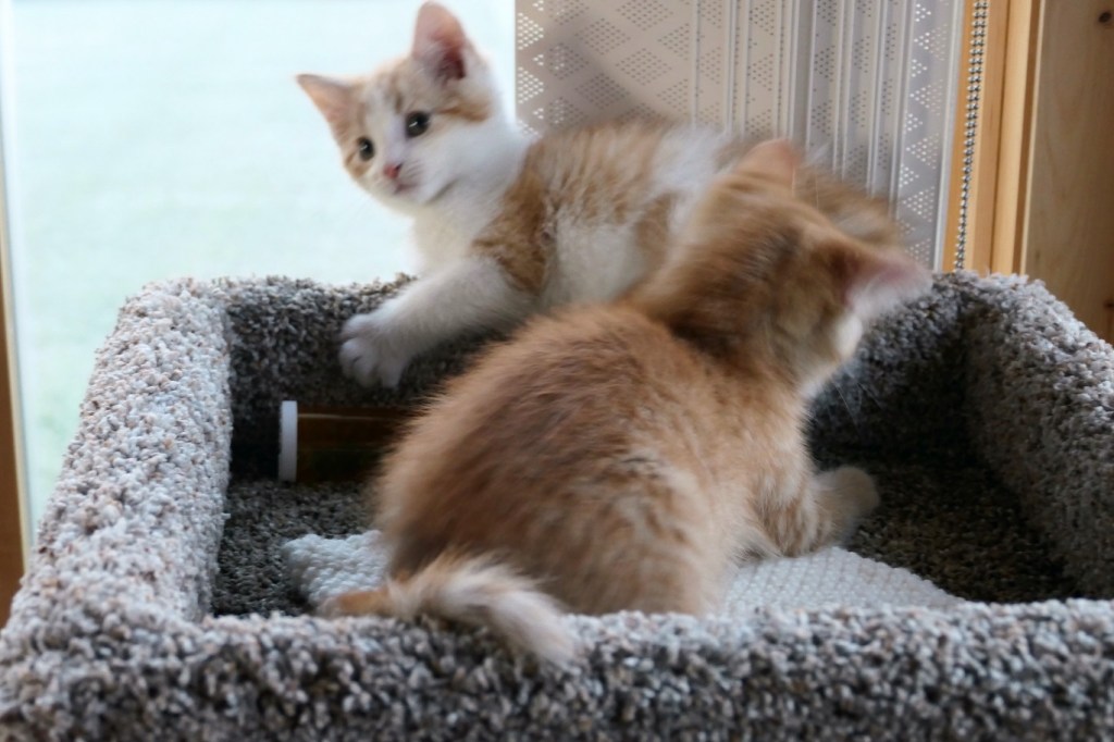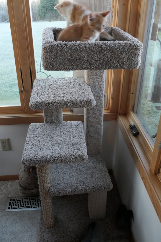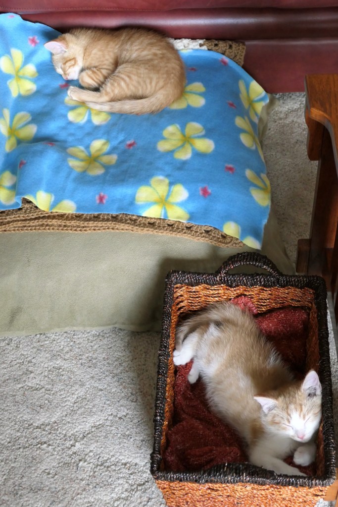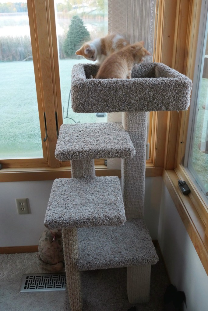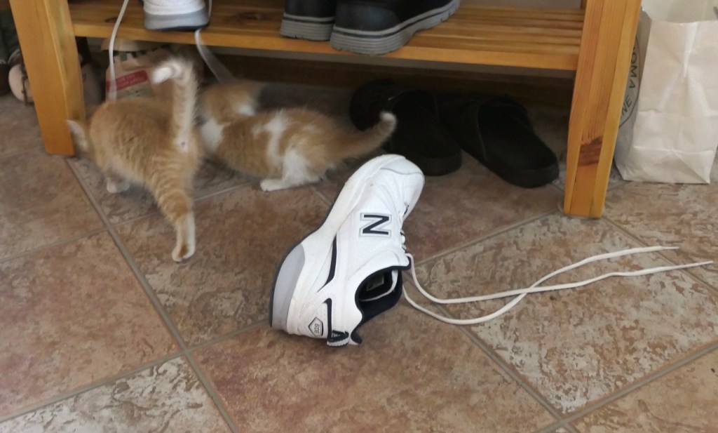 [After the trip down through the bomb-cratered I-94, we decided to come home on 169 until we hit 10 which we took all the way to Clear Lake before cutting back to the interstate – much better. Then the kitties in their new home immediately went for the laces on my walking shoes, pulling the shoes off the bench shelf. Let the excitement begin . . . ]