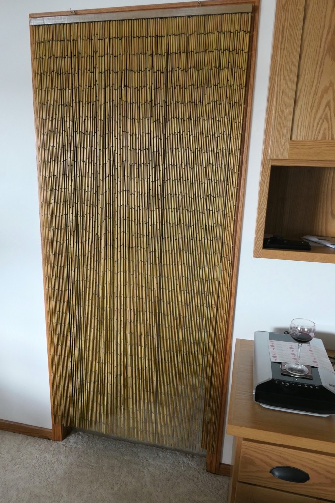[A concession to our down-sized house. The laundry room opens into the living room. The cat’s unisex bathroom is in the laundry room. The laundry room door, accordingly, must remain open. It’s not a pretty sight, particular from my office there on the right. Thus, we decided this bamboo curtain would work for all parties involved . . . ]