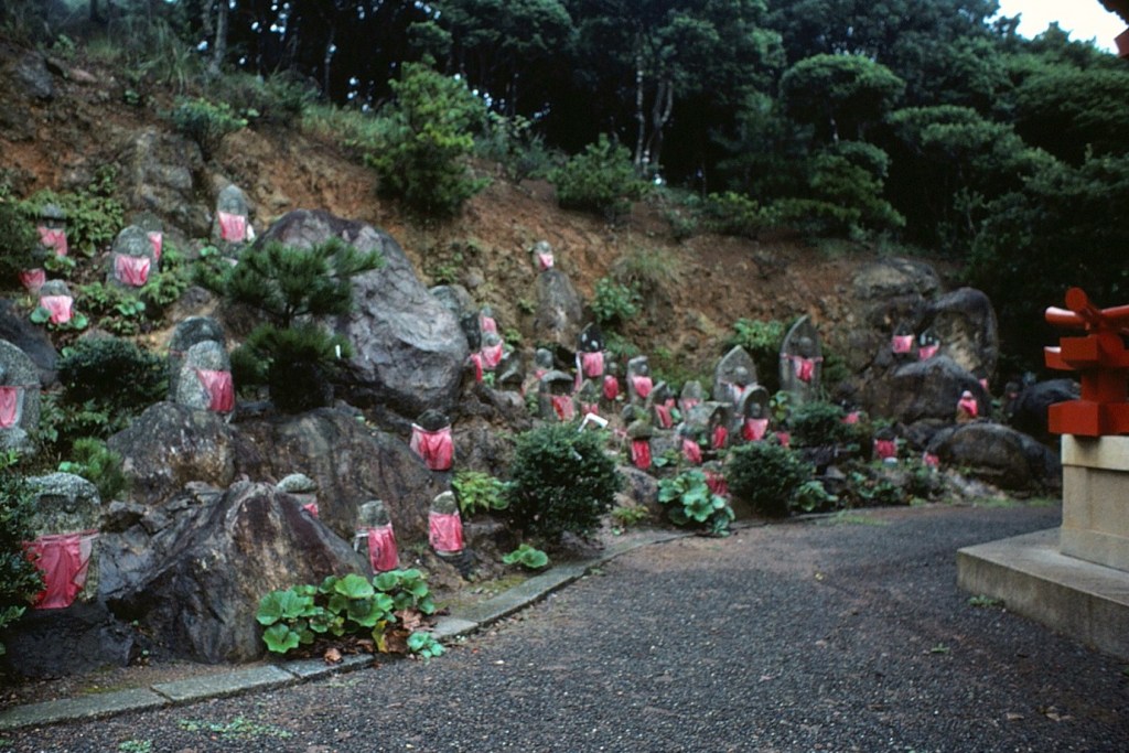 [Any tourist trekking Japan’s countryside and visiting roadside temples will quickly notice the many stone statues that litter the rural streets of Japan. These are the statues of Jizo. They are often clothed in stone robes and hold canes and are dressed in red bibs. They are often bald, smiling serenely, with eyes closed. Some, however, are faceless formless stones, only distinguished by the red bibs and aprons wrapped around them. Traditionally it is believed that Jizo is the guardian of unborn children. One often finds the ojizosan in graveyards. According to one legend, children who die before their parents are punished for making their parents grieve, and must build small stone towers to gather good karma. Demons often come to smash the stone towers and beat the children, but Jizo protects the children by hiding them in his sleeves and robe. Flower and water and food offerings, and even small towers of stones are often visible in front of ojizosan, placed there by grieving parents hoping for protection for the souls of their children (buddhistchannel.tv/index).]