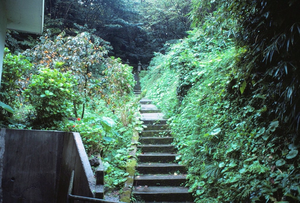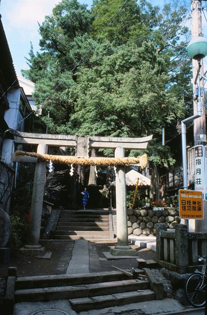[Hie Jinja Shrine is one of the 3800 branch shrines under San-no So Honsha (The main shrine of San-no located in Hie-zan). In 807, Kukai (or Kobo Daishi) set up this shrine at the same time he established Shuzen-ji Temple. Although Hie Jinja doesn’t have a big precinct, huge trees are scattered about, and show its sacredness. Two cedar trees attached together at their roots is a symbol of blessing of children (Kodakara-no-sugi). The trees are more than 800 years old and decorated with holy straw ropes. Go through between the trees, making a wish about your children, and then you and they will be blessed (en.japantravel.com).]
