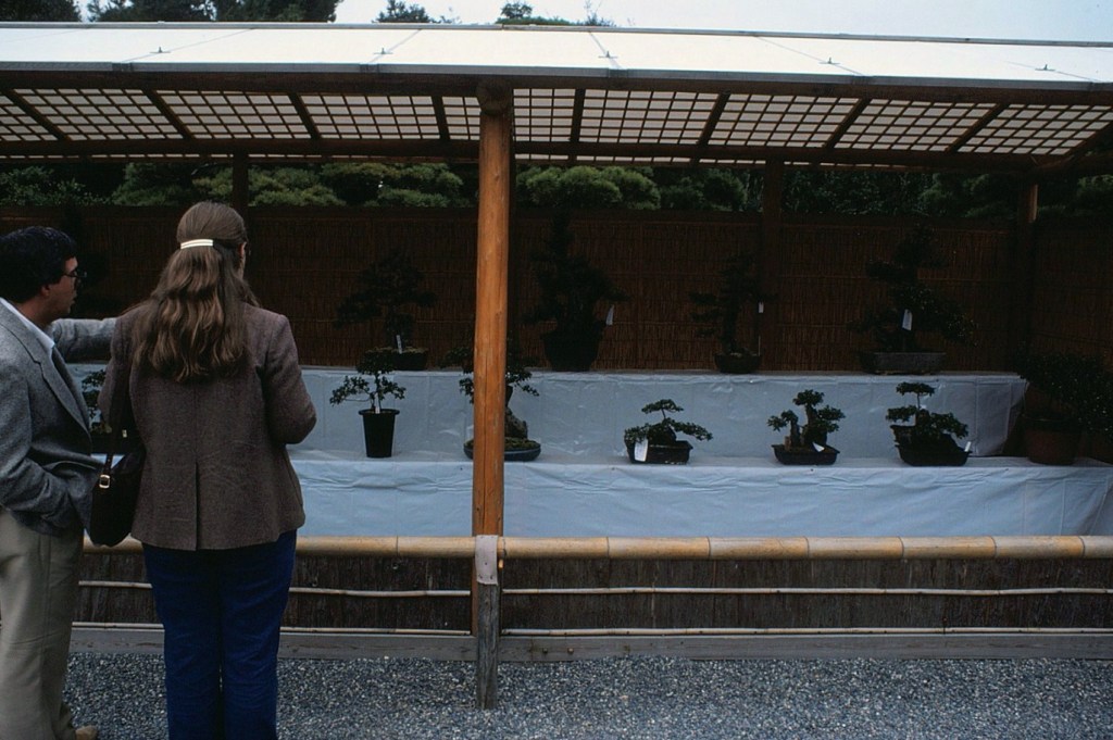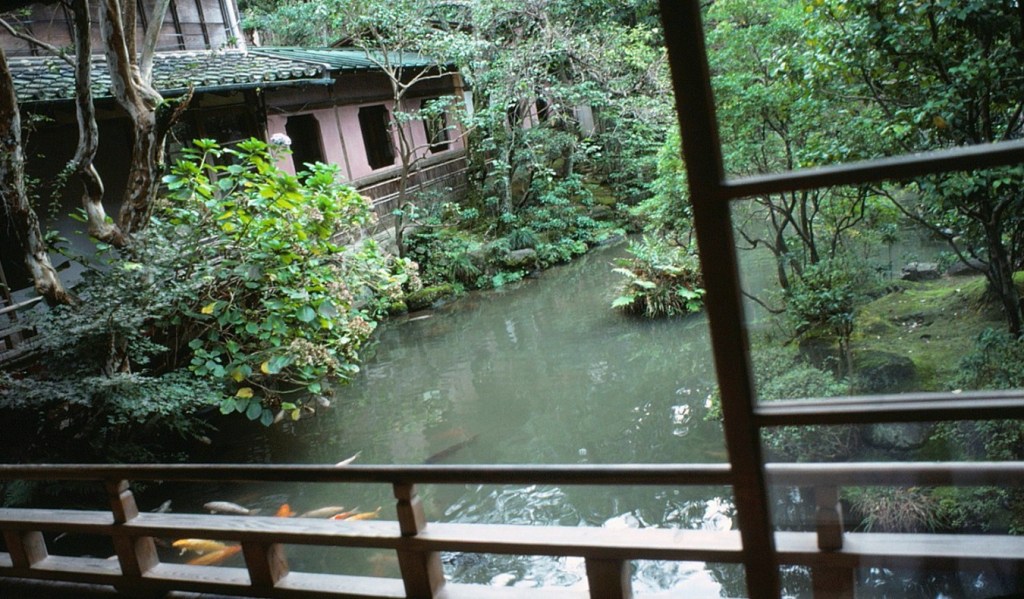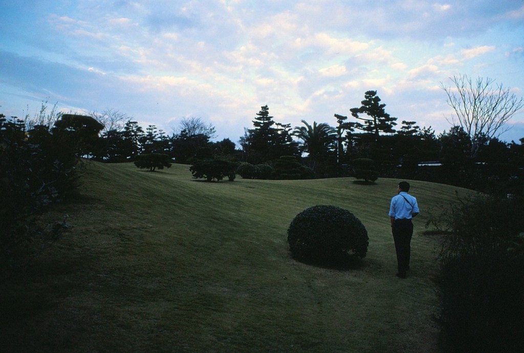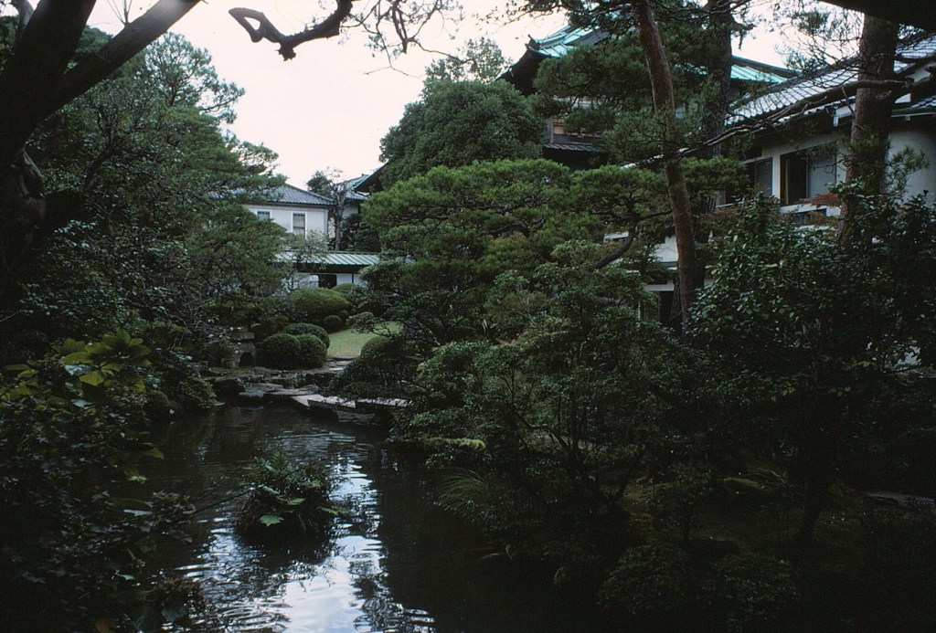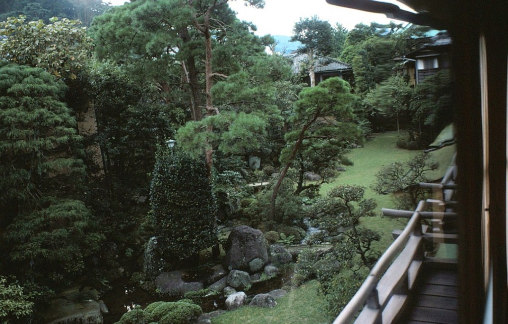 [Beautiful example of Japanese shakkei, the principle of incorporating background landscape into the composition of a garden . . . ]