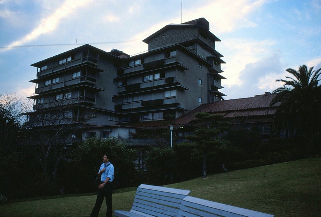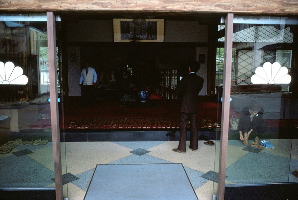 [The office, with our guide in his ever present brown suit, where one drops off one’s shoes in favor of slippers. A Japanese tradition nonpareil (I seldom wear shoes in the house) . . . ]