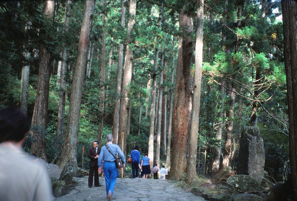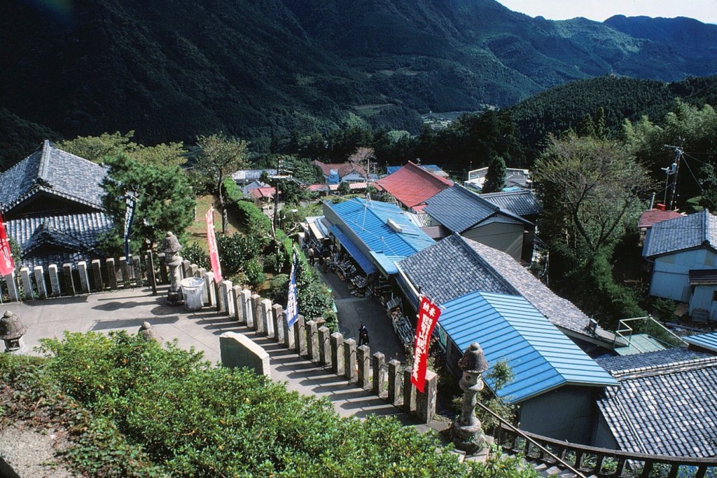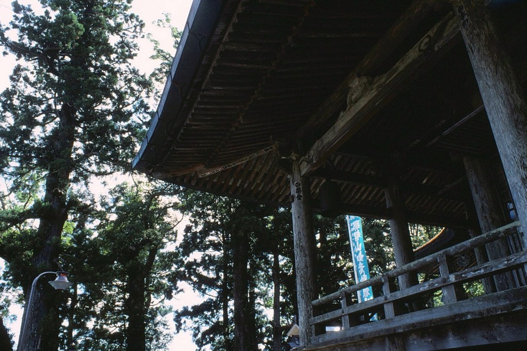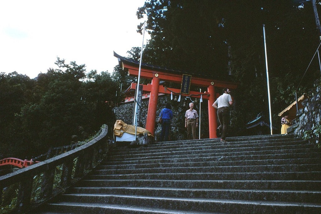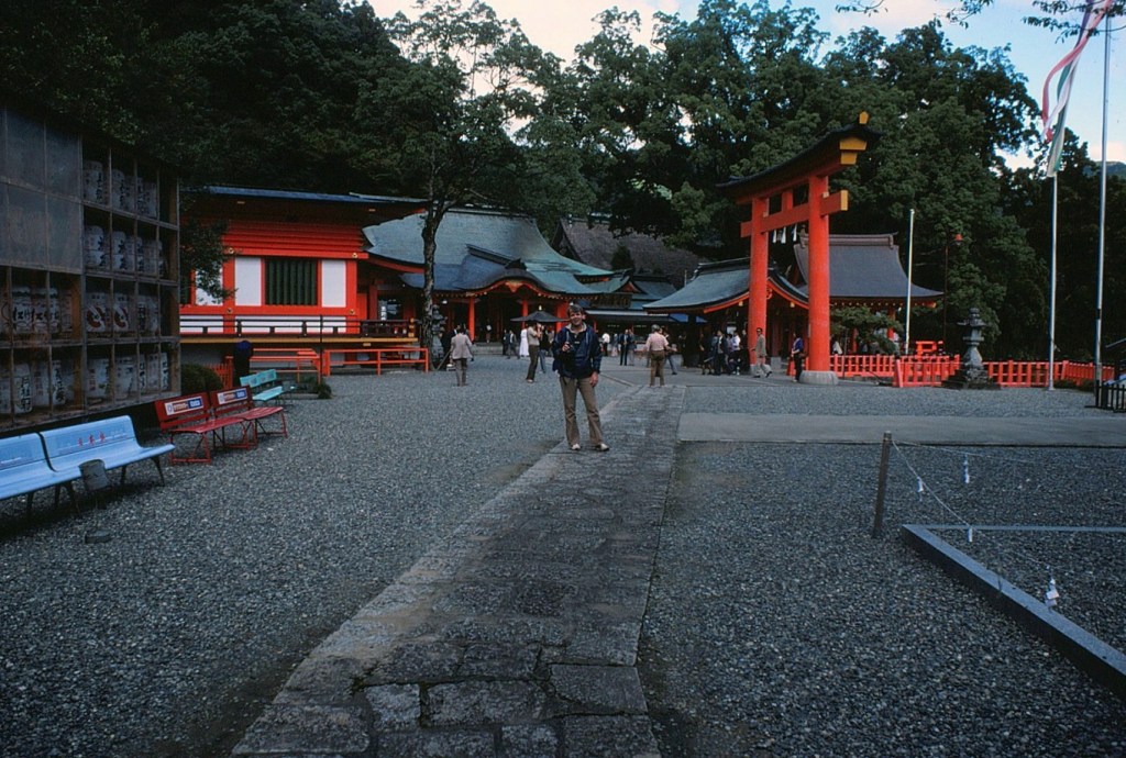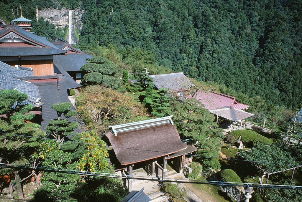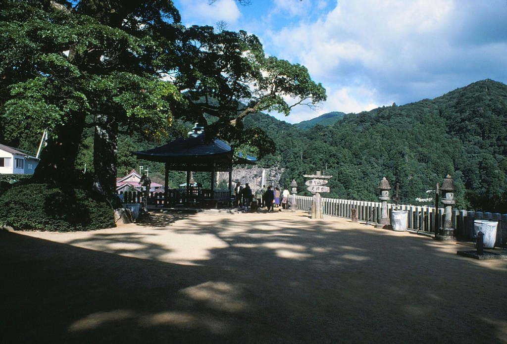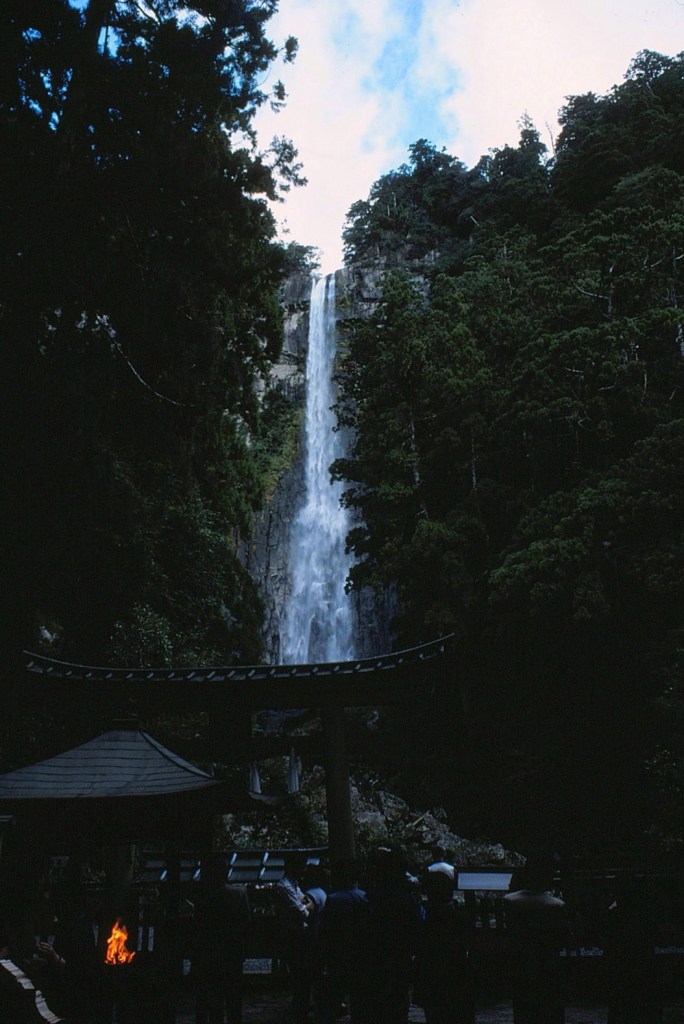 [Kumano Nachi Taisha is a Shinto shrine and part of the UNESCO-designated World Heritage Sacred Sites and Pilgrimage Routes in the Kii Mountain Range. The Kumano Kodo route connects it to other sites under the same classification, which are primarily located in Wakayama Prefecture. The four sites on the route, classified as pilgrimage destinations and World Heritage Sites, are: 1) Nachi Taisha; 2) Hongu Taisha; 3) Hayatama Taisha; 4) Koya-san. This classification is based mostly in Japanese history, as pilgrims would travel to all three sites to complete their pilgrimage. Kumano Nachi Taisha is an example of Buddhist and Shinto syncretism (Shinbutsu shugo) nestled in the Kii Mountains, near Kii Katsuura. Cedar forests surround the site. The Nachi Waterfall, worshiped at the Hiryū Shrine near Kumano Nachi Taisha, is believed to be inhabited by a ‘kami’ called Hiryū Gongen. Also, there is a sacred tree at this site, the Sacred Camphor Tree, located between the Nachi Shrine (heiden) and Seigantoji Temple. It is 850 years old and is said to have been planted by Taira-no-Shigemori (1138-1179). The straw rope (‘shimenawa’) and paper flags show that this tree has been sanctified as a ‘kami’. The tree is alive with moss and ferns and other small plants growing on its ancient limbs. It is possible to enter the tree, where there is a small altar for making offerings. Nachi-no-Hi Matsuri Fire Festival, performed on July 14, is the major festival of Kumano Nachi Taisha. It is a fire festival in which six-meter-high portable shrines symbolically representing the purification of the waterfall with the fires from oversized torches is laboriously carried by men dressed in white (Wikipedia).]