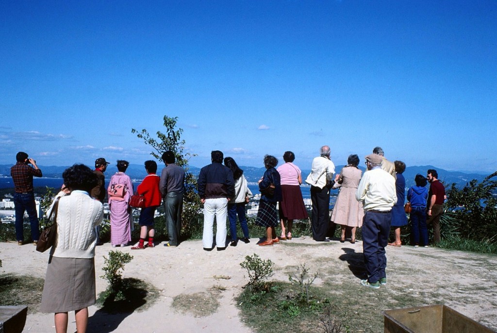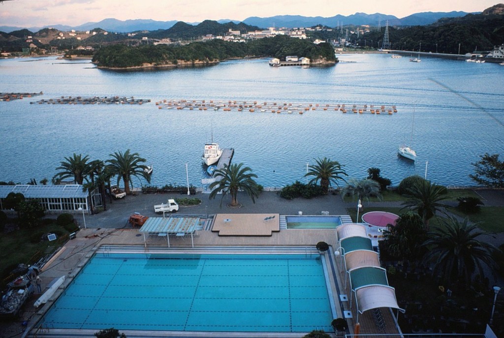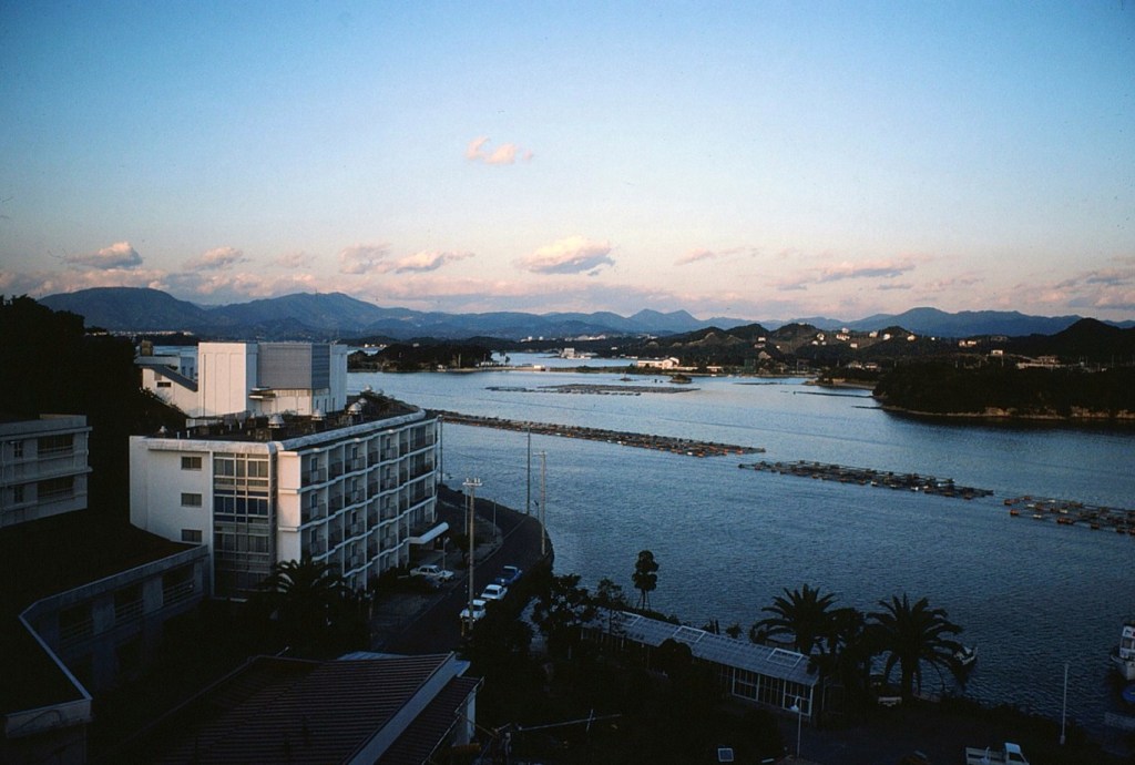 [In the above photo, we were obviously in a glass bottom boat somewhere in open water. Yet, this next photograph we were at our next hotel overlooking an oyster farm in Shirahama (I believe) . . . ]