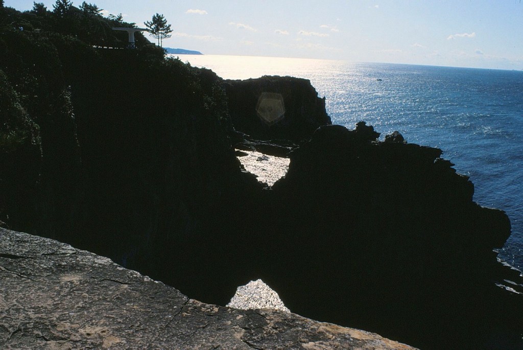 [“Engetsuto” is a small island in Rinkai-ura Ocean in Shirahama-cho. The name “Engetsuto” means “Island of the full moon”, and is a nickname given to the island, inspired by the moon-like round hole in the center of the island. The island’s official name is “Takashima”. The island measures 130 meters (from south to north), 35 meters (from east to west), and 25 meters (in height). The hole measures 9 meters (in height) and 8 meters (in width) (thegate12.com).]