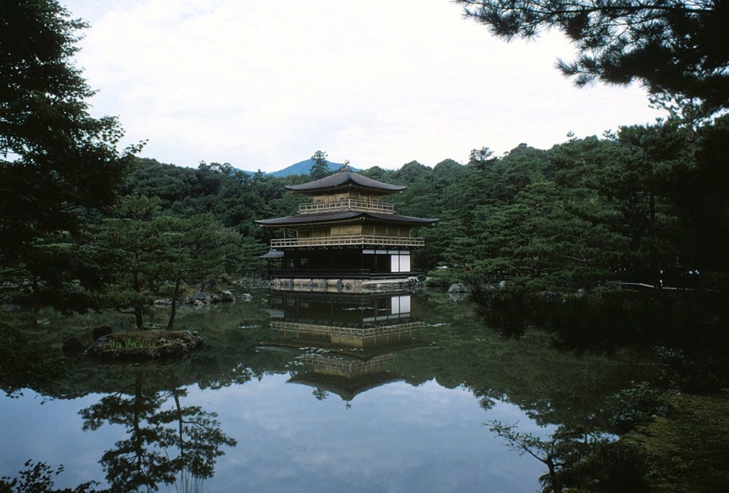 [Kinkaku-ji (literally “Temple of the Golden Pavilion”), officially named Rokuon-ji (literally “Deer Garden Temple”), is a Zen Buddhist temple in Kyoto. It is one of the most popular buildings in Kyoto, attracting many visitors annually. It is designated as a National Special Historic Site, a National Special Landscape and is one of 17 locations making up the Historic Monuments of Ancient Kyoto which are World Heritage Sites. The name Kinkaku is derived from the gold leaf that the pavilion is covered in. Gold was an important addition to the pavilion because of its underlying meaning. The gold employed was intended to mitigate and purify any pollution or negative thoughts and feelings towards death. Other than the symbolic meaning behind the gold leaf, the Muromachi period heavily relied on visual excesses. With the focus on the Golden Pavilion, the way that the structure is mainly covered in that material creates an impression that stands out because of the sunlight reflecting and the effect the reflection creates on the pond. (Wikipedia).]