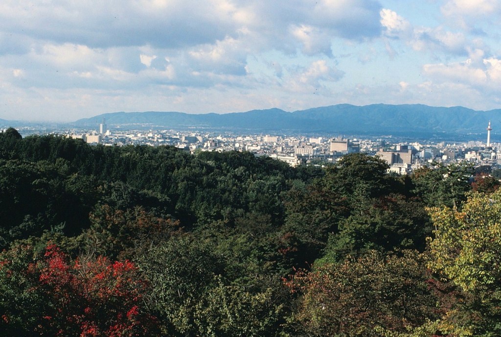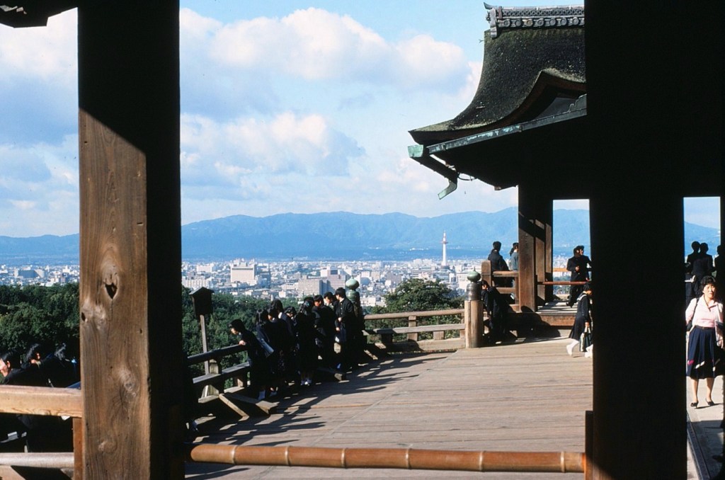 [In the distance below, a cheerful beacon of 1960’s optimism, Kyoto Tower stands at 131 meters high from its base to the tip of its spire, and it is the tallest structure in Kyoto. As such it dominates the skyline and can be spotted from many of the sightseeing locations around the city. For a little over 50 years this curious structure has split opinion between those who see it as a symbol of modern Kyoto, and others who see it as a tacky and inappropriate folly (kyotostation.com).]