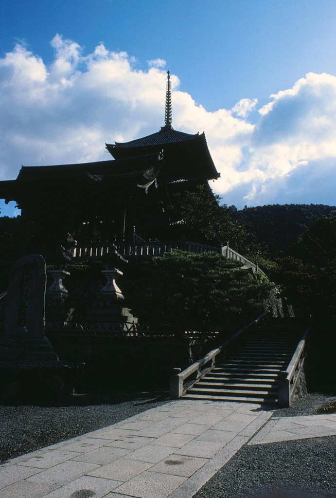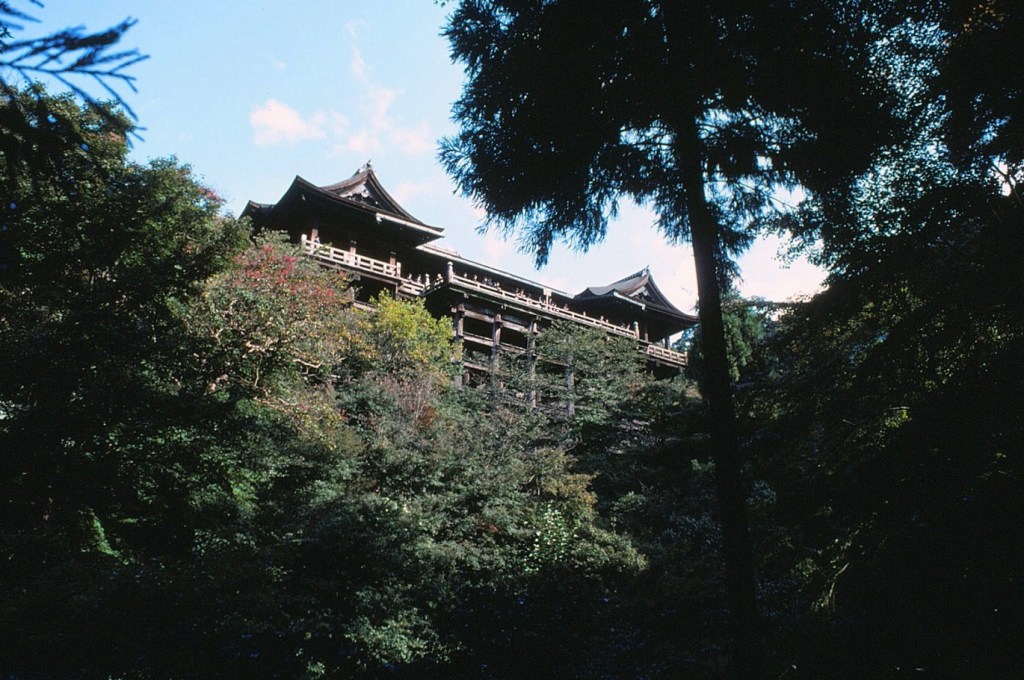 [Kiyomizu-dera, formally Otowa-san Kiyomizu-dera, is a Buddhist temple in eastern Kyoto. The temple is part of the Historic Monuments of Ancient Kyoto (Kyoto, Uji and Otsu Cities) UNESCO World Heritage site. Kiyomizu-dera was founded in the early Heian period. The temple was founded in 778, and its present buildings were constructed in 1633. There is not a single nail used in the entire structure. It takes its name from the waterfall within the complex, which runs off the nearby hills. Kiyomizu means clear water, or pure water. The main hall has a large veranda, supported by tall pillars, that juts out over the hillside and offers impressive views of the city. Large verandas and main halls were constructed at many popular sites during the Edo period to accommodate large numbers of pilgrims. In 2007, Kiyomizu-dera was one of 21 finalists for the New Seven Wonders of the World, but was not picked as one of the seven winning sites (Wikipedia).]