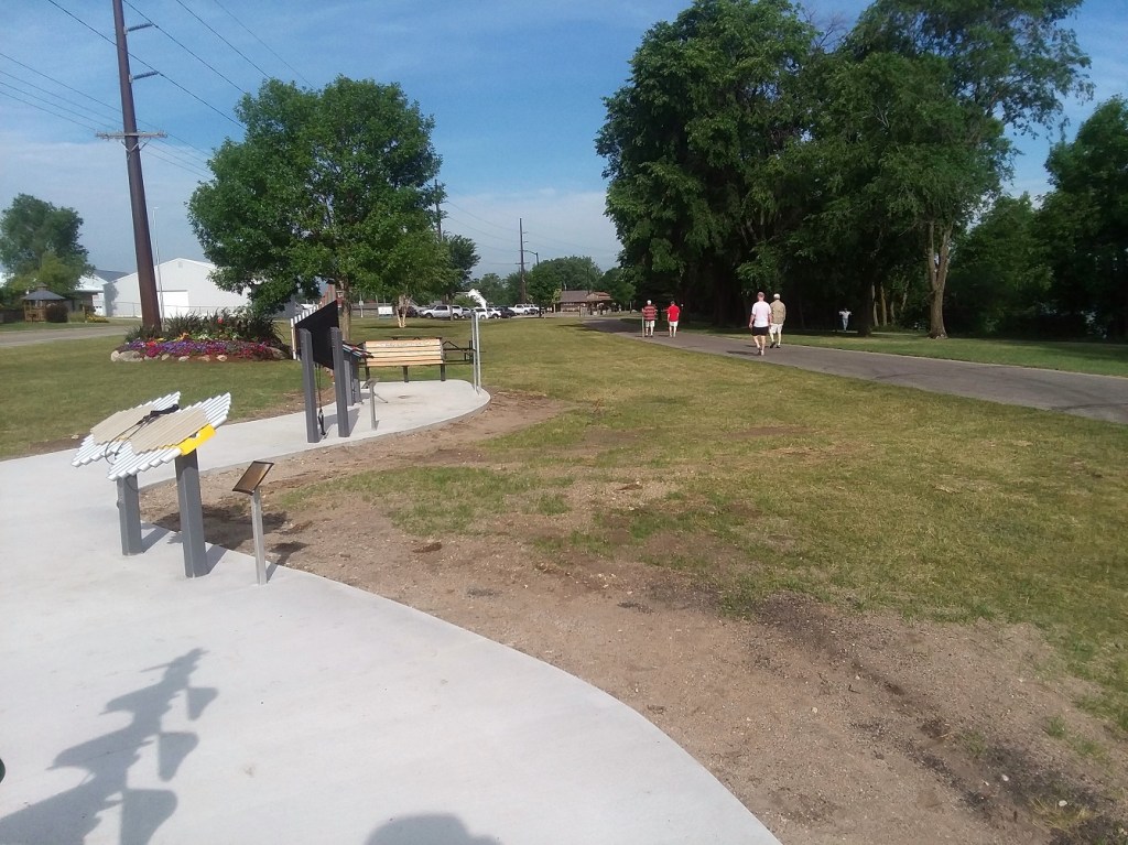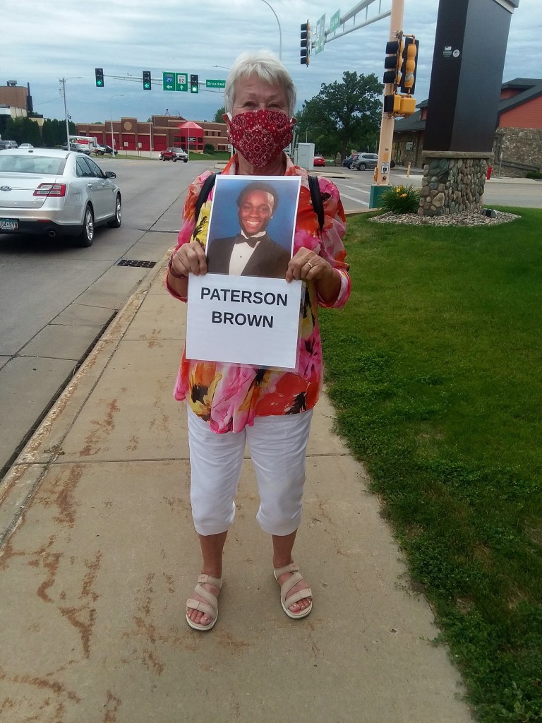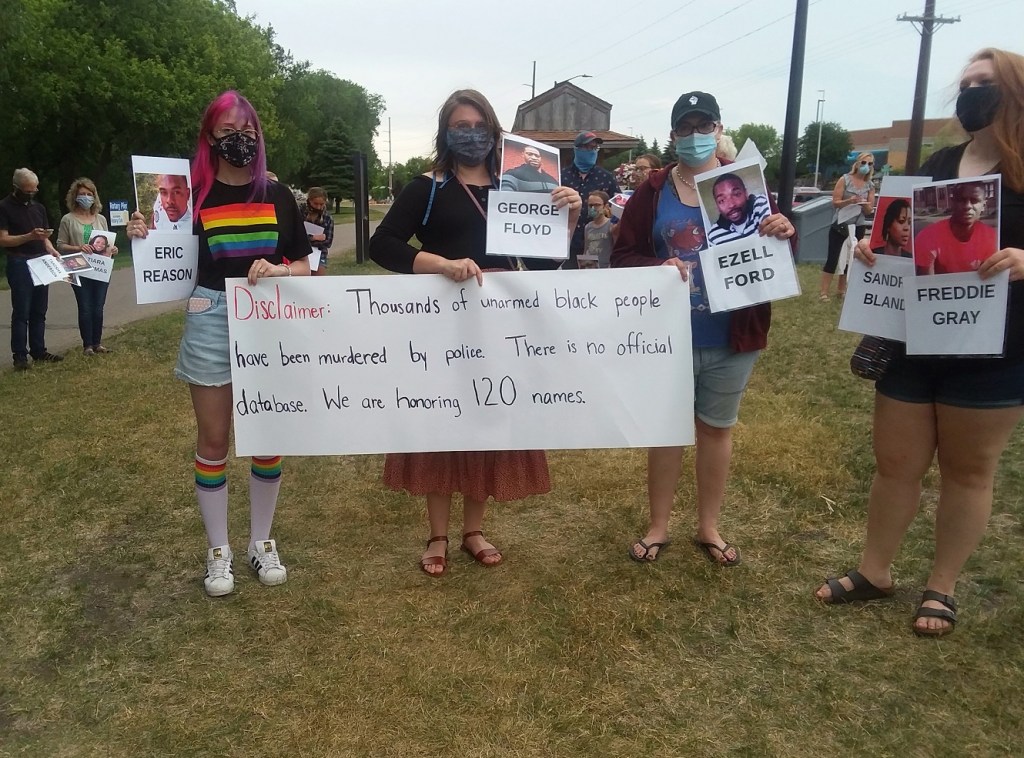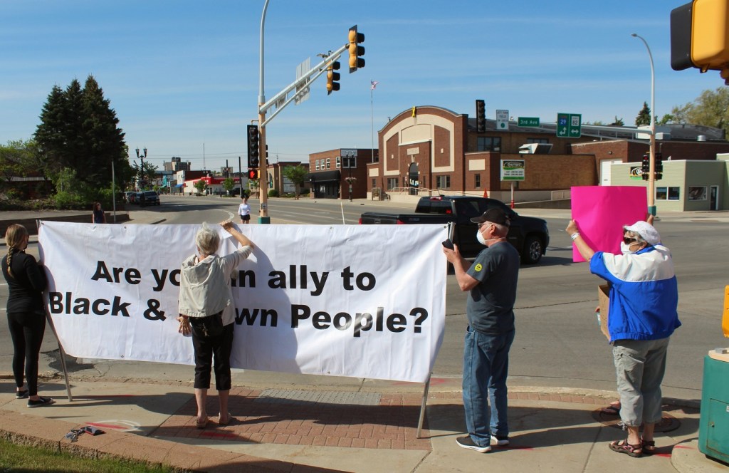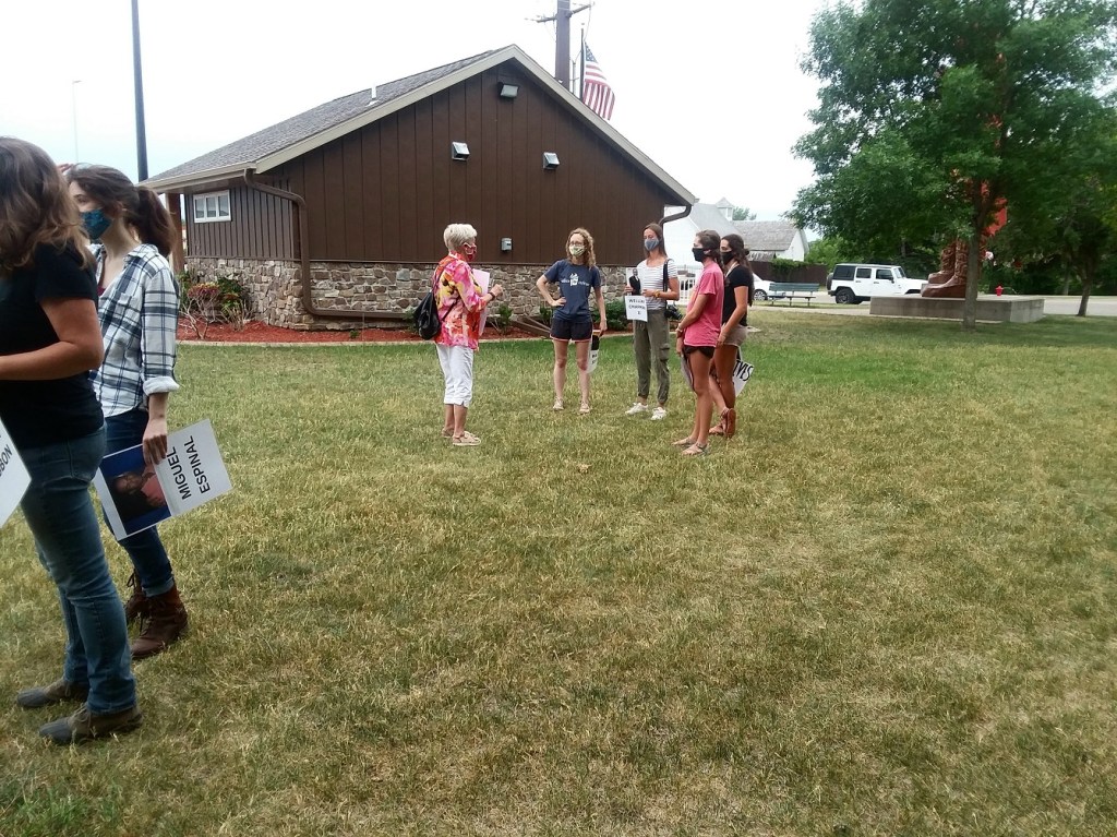 [And then we joined a Change in Motion rally at Big Ole park. Change in Motion, started by two Alexandria college freshmen, is an organization for racial justice. Here the Super is talking with four college students . . . ]