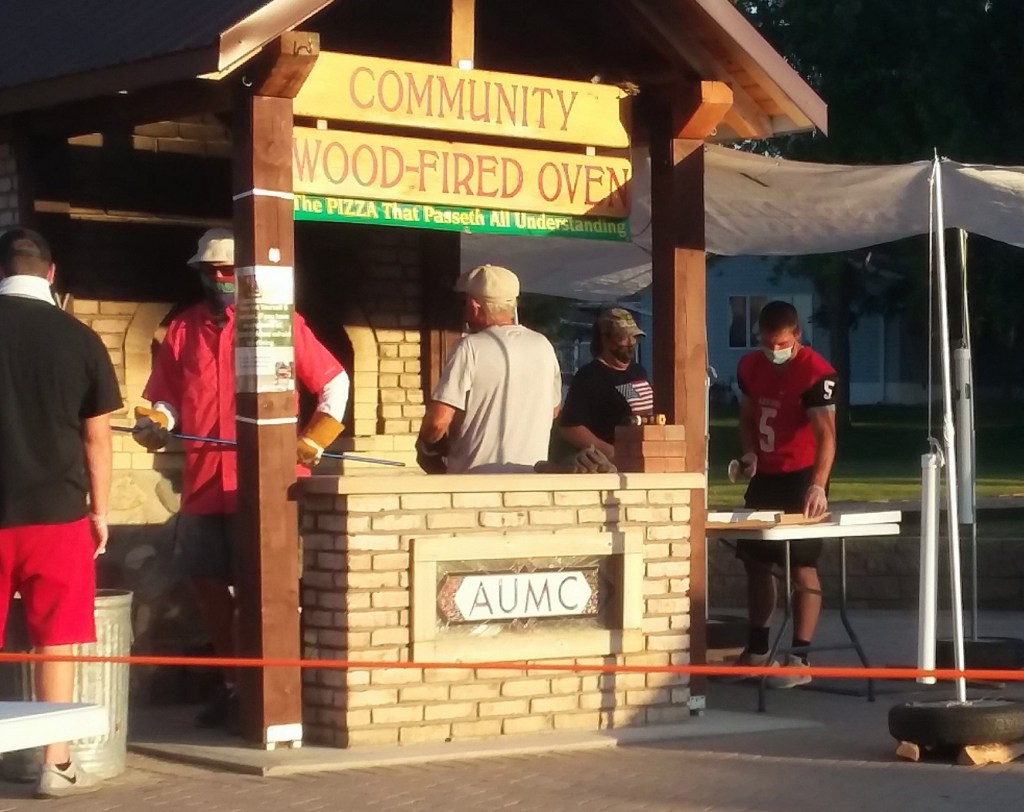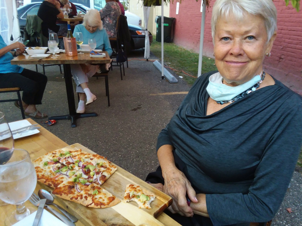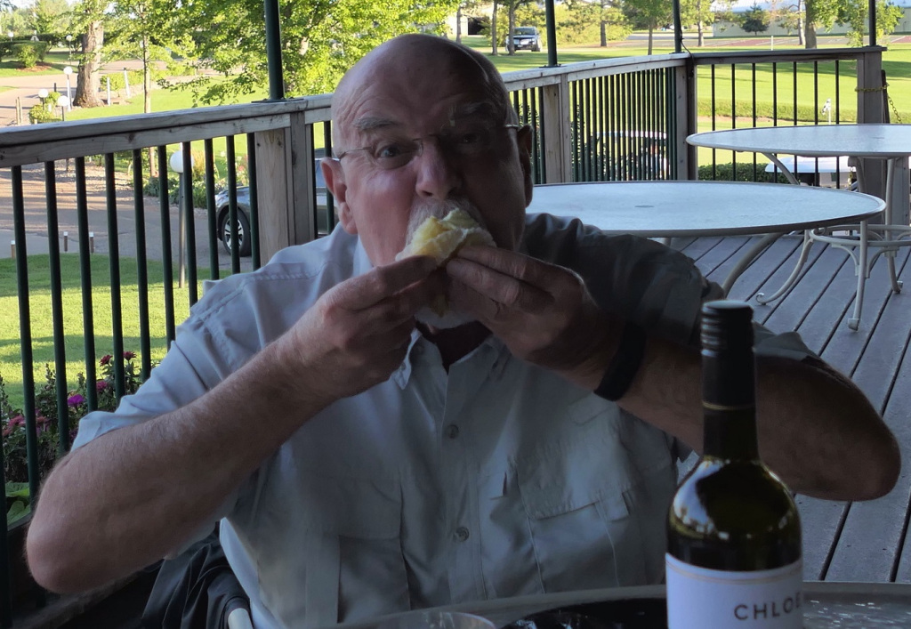 [Wednesday fine golf club dining conflicted with pizza night at the Methodist church wood-fired pizza oven. We often ate first at the golf club, then went to church and got a take home pizza for the next night. The Cardinal No. 5 helping in the background is Alexandria football’s all-time leading rusher . . . ]
