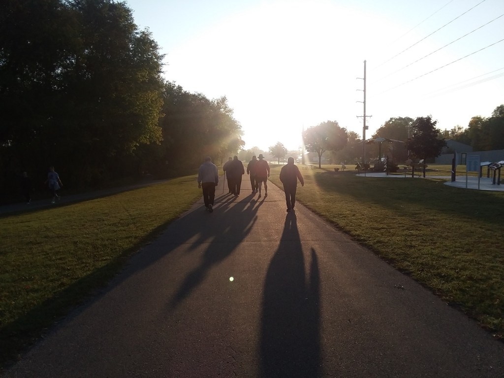 [The Fat Boys Walking Club returning to their parked cars in Big Ole Park. The pandemic required a change of venue to the great outdoors for our daily amblings . . . ]