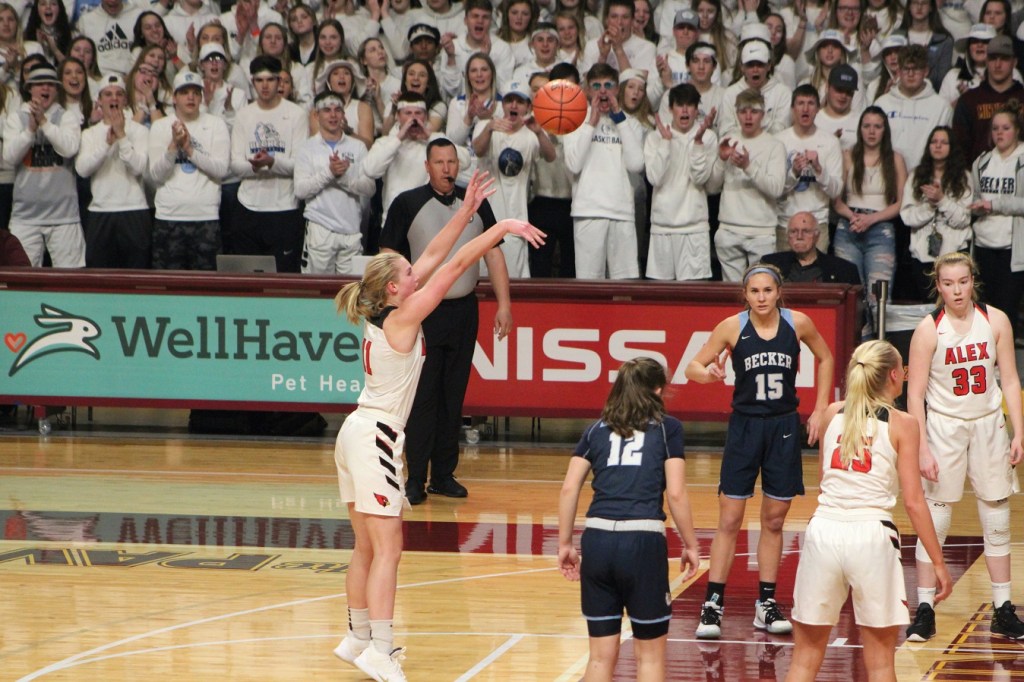 [The Ella theme then led us into the COVID theme. This was the state tournament on the campus of the University of Minnesota. Alex played No. 2-ranked Becker in the first round. I liked this photo because Alex was in white, and Ella was shooting a free throw against a backdrop of white clad Becker fans. Alex lost a close game, then won the 1st round of the consolation bracket the next morning, and then everything stopped. This is when the pandemic shut everything down. Ella was nevertheless named to the all tournament team . . . ]
