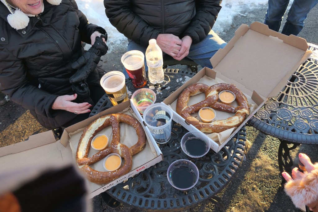 [How best to take my leave – soft pretzels, cheesy dip, roaring fire, and a beverage of choice!]