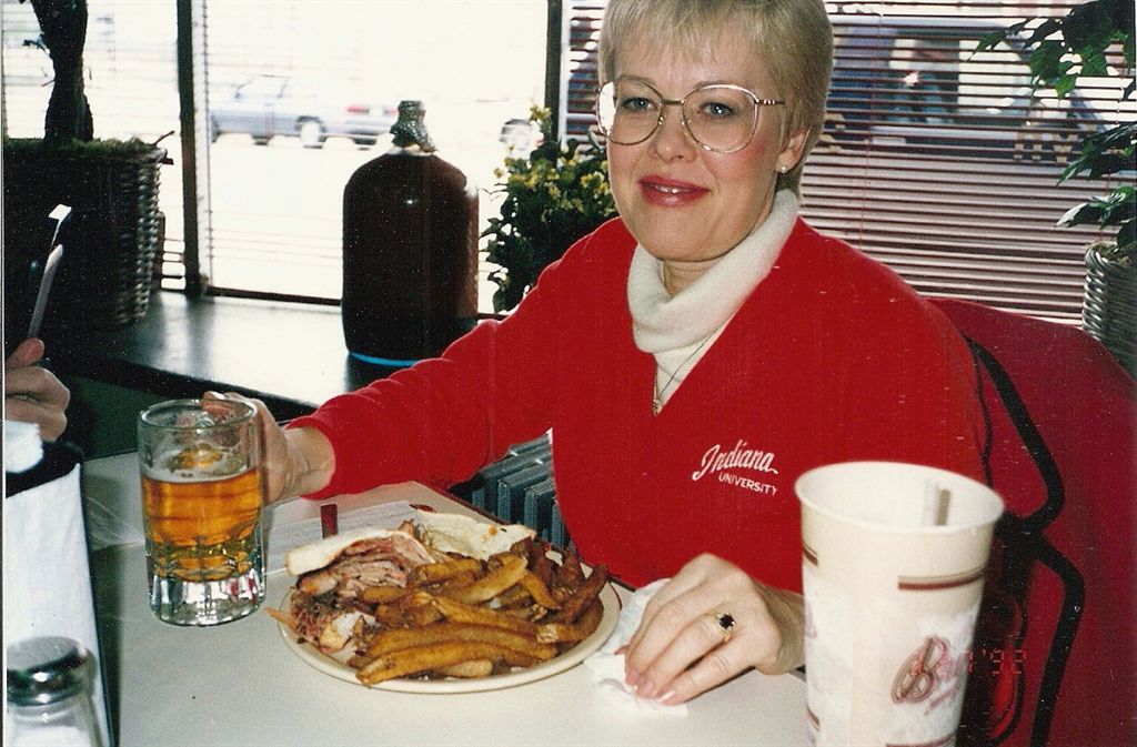 [I knew this photo was taken at the internationally famous Arthur Bryant’s in Kansas City – I just couldn’t remember the year or the event (though for sure a basketball trip). I sent a query to Basketball Dan. His response was almost immediate, thus showcasing why he is known as The Great One: My first thought was ’92  (but then I couldn’t remember you being there), that was one of my most memorable regionals ever (not because the games were boring and terrible) because on Selection Sunday, it looked like the teams there would be KU (ranked #1 in the country), Iowa , and USC (with Harold Miner, aka ‘Little Jordan’, the most exciting player in the country).  I somehow managed to acquire a total of 16 tickets, and with Andy and Jerry Norman also going, we figured to make a substantial killing on scalping those extras.  So Iowa loses in the first round, KU is upset by UTEP on the first weekend, and Georgia Tech throws in a 35 footer at the buzzer on the first weekend to upset USC by 1 pt.  So the field of UTEP, Cincy, Ga Tech, Memphis didn’t even fill half of Kemper.  I think we sold a couple tickets for $5 each….Jerry forgot something in the car, so I just handed him one of the 10 extras and he came back in a 2nd time. So it had to be ’95 when this pic was taken (I can’t claim to remember the exact years without Wikipedia, but I remember most of the teams and who all was there)…..Andy and Sharon came up from Wichita, Pete and Patti Blasco came from Portland, and I know I didn’t drive back home by myself, so it must’ve been the 3 of us.  Blasco’s came because UVa was playing, and they upset #1 seed KU, but then lost to Arkansas (the year after Hogs won it all in Charlotte…..that was where Ruthie got an autograph from Ray Ohs of Arizona at some restaurant after the Saturday games).  Fortunately UCLA (coached by Honest Jim Harrick) beat Arkansas in the championship game (as I despised that Hog team).  You guys were definitely there in Seattle…we stayed at a cheap motel on the East Side of Lake Washington, and I recall panicking when I got to my room and saw that I had  a wild rash all over my back……and we talked to Eddie Sutton is some hotel gift shop on the way to the Saturday games (Ok St led by Big Country). There’s nothing left but the memories!]