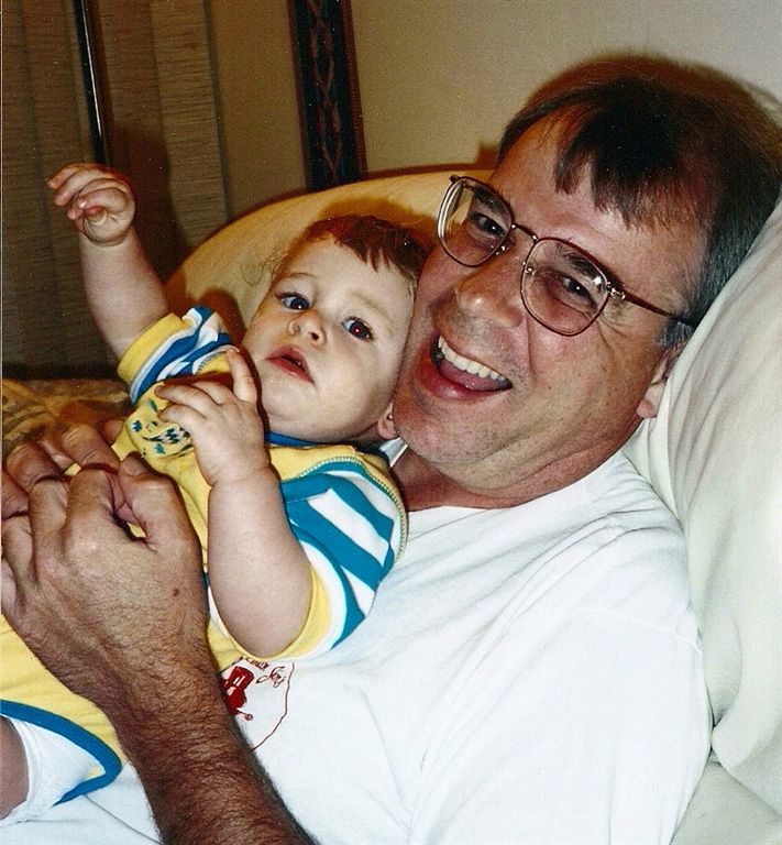 [In 1994, with grandson to be, Tom. Ruthie & Jami went shopping and left me to babysit. When they returned I was asleep on the couch with the one-year old Tommy standing next to me. I was never good with kids . . . ]