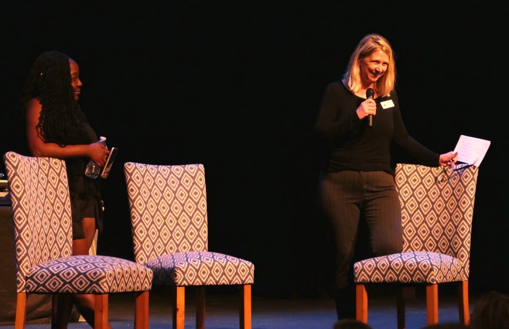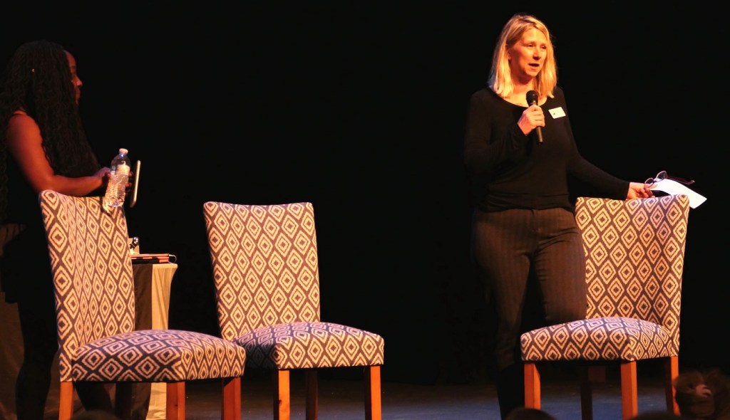 [The above photo was the Super’s opening salvo; beneath is mine of theatre executive director Nicole Mulder introducing Jo as the host of the Juneteenth discussion . . . ]