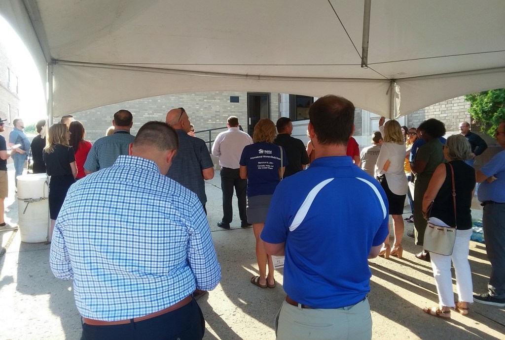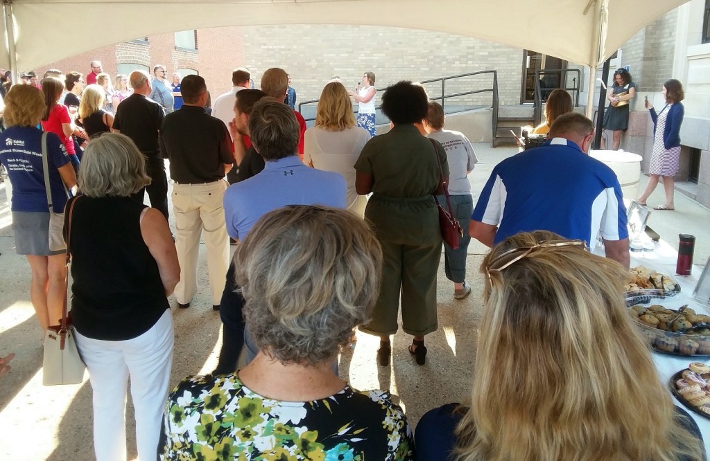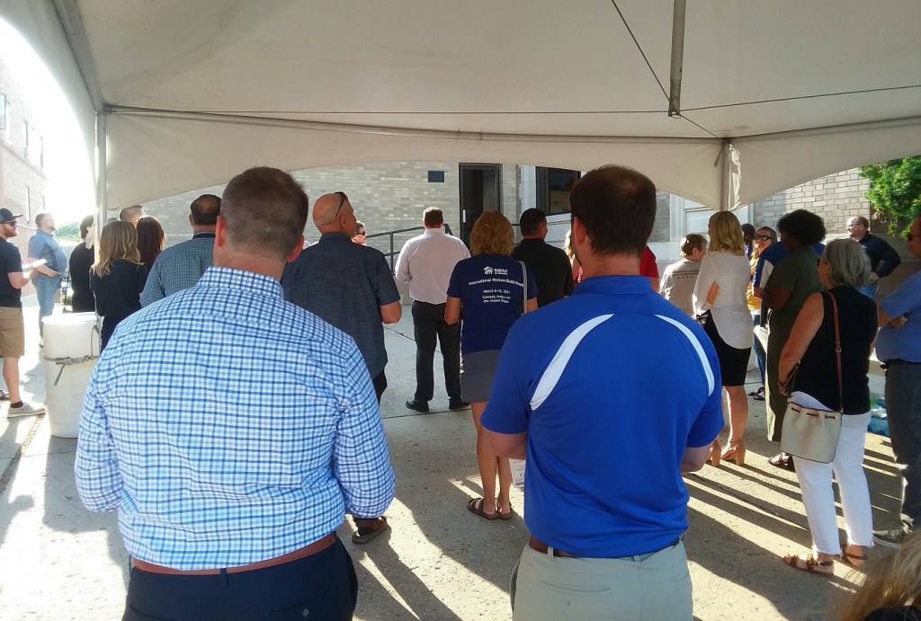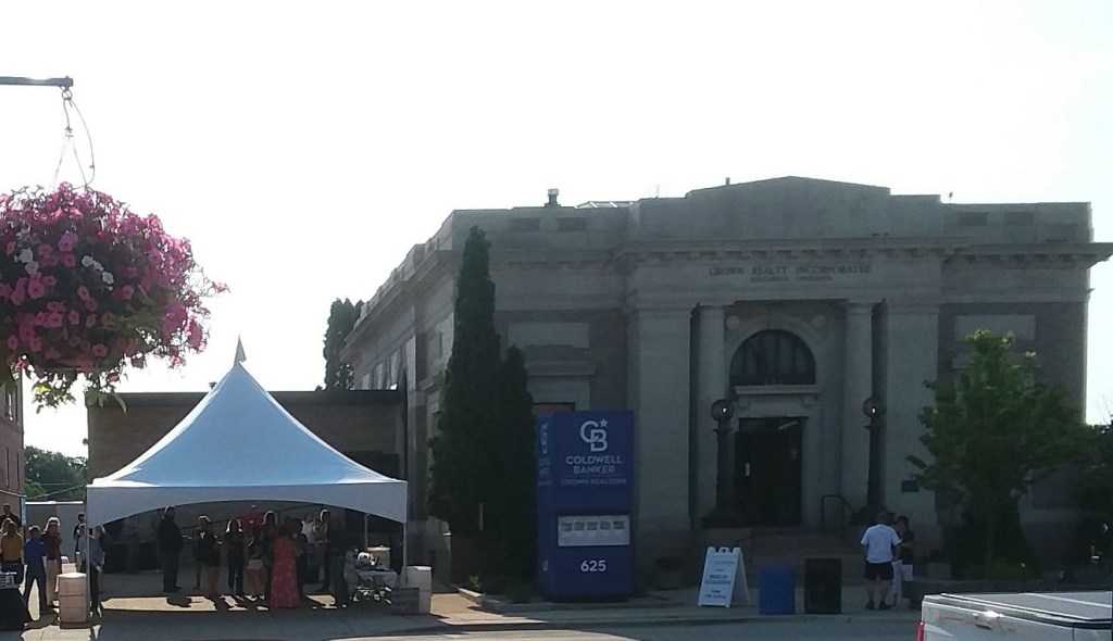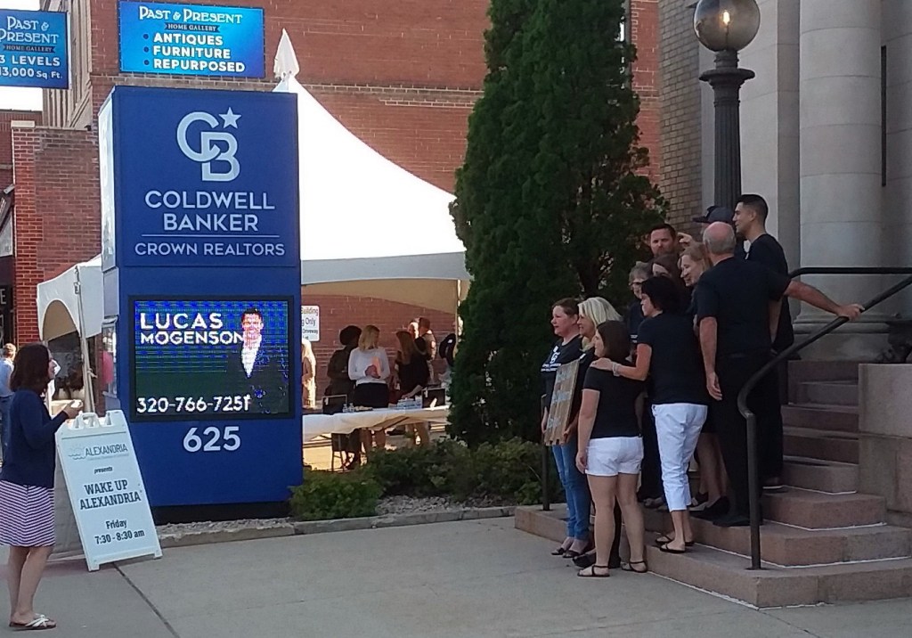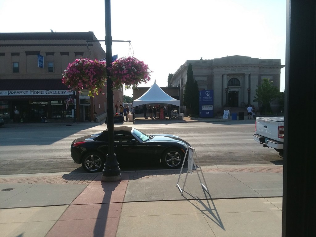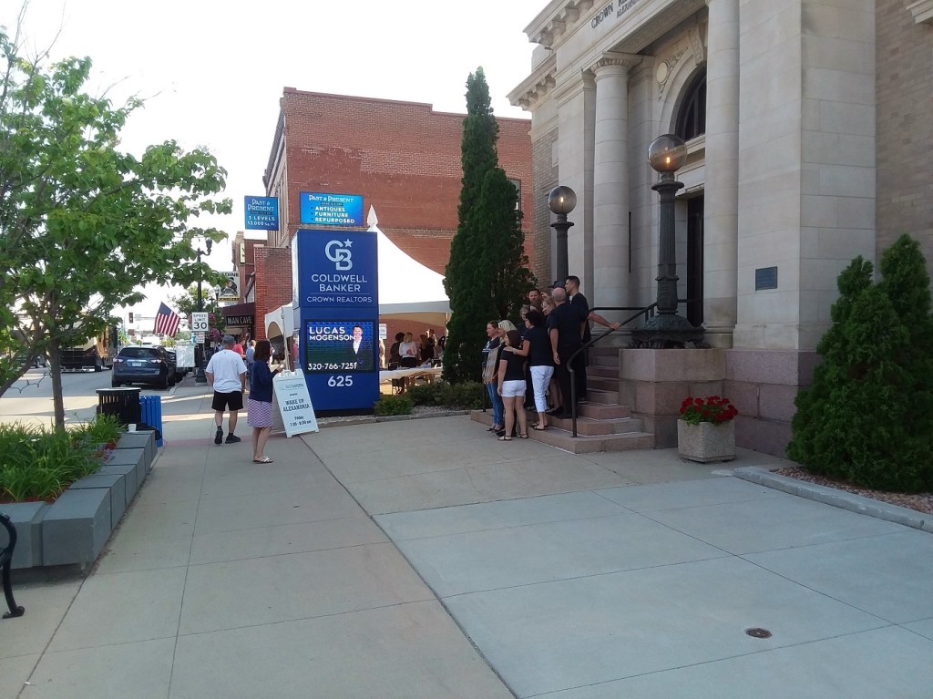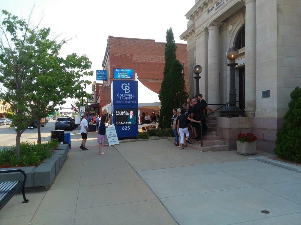 [Of course one must always cross at the light, so here’s looking back at the Chamber of Commerce event from the corner of 7th & Broadway . . . ]