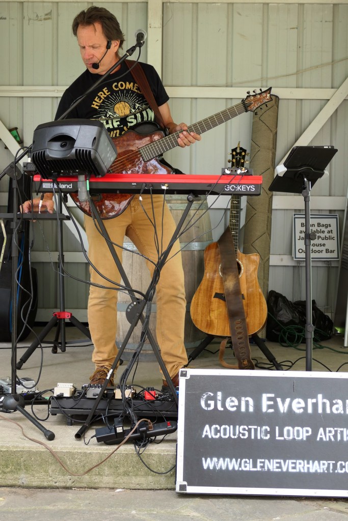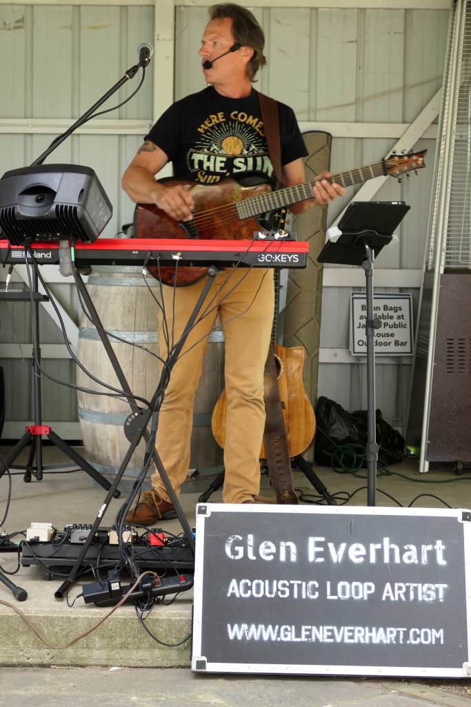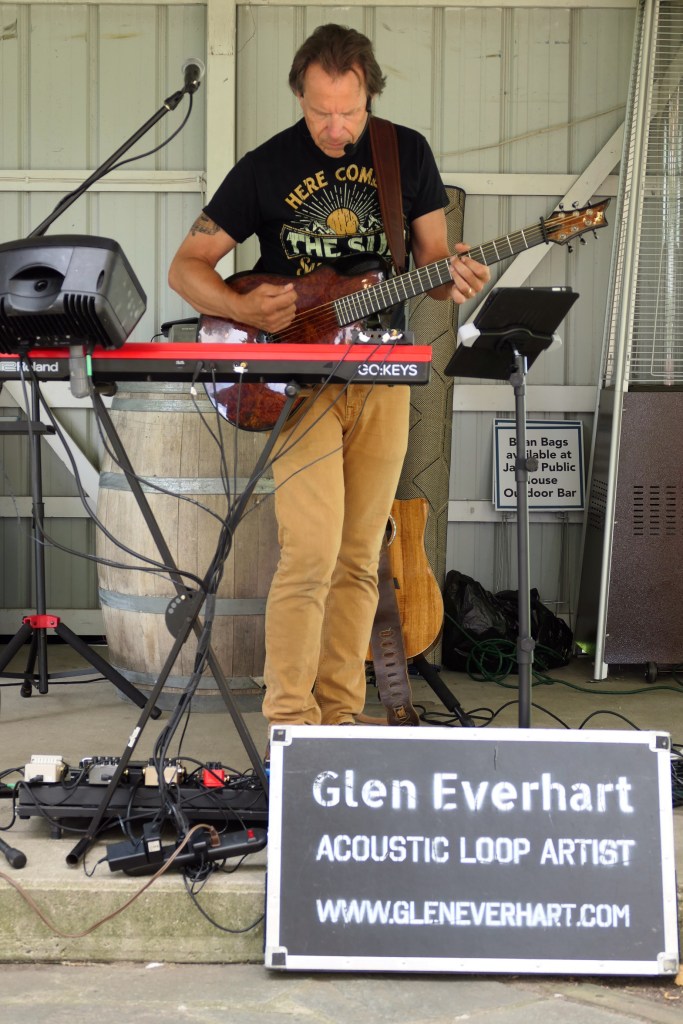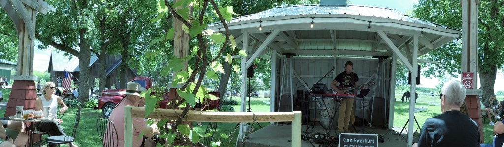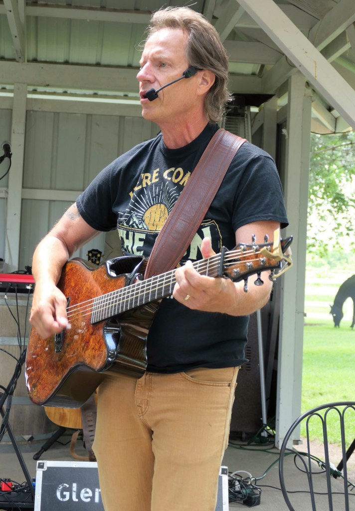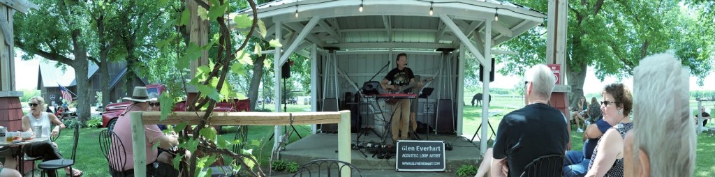 [Glen Everhart took the stage at Carlos Creek Winery. Glen has been driving from Blaine to Alexandria to perform for over 30 years. He estimates he has performed at Arrowwood over 400 times (used to be every Wednesday during the season, now four times a year). Yet this was his very first time at the winery . . . ]