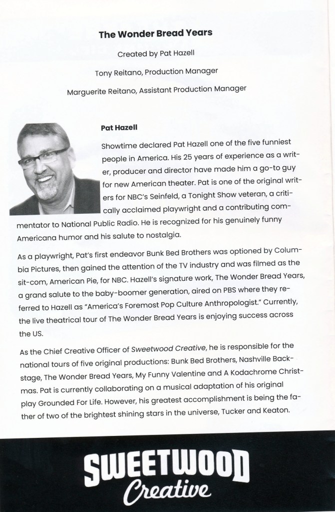 The Wonder Bread Years made me laugh so hard I pulled a groin muscle . . . at least I think that’s when it happened? The fun part about going on opening night is that the audience gets to party with the talent afterwards. We really enjoyed chatting with Pat after the show while sampling adult beverages and salty crunchy snack food items . . .