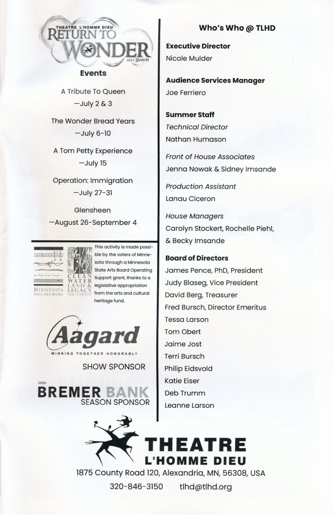 [There’s a story (isn’t there always?). We spent the afternoon at the winery. Came home for a nap, dinner at home, and “Midsomer Murders” before going to bed. Then the Super decided she really needed a hamburger. Where to go? Golf club is closest, but there was a tournament going on. Checked in there anyway and discovered burgers not available because of pre-planned menu for the golfers. The Lure would be next. Beautiful evening as it was, we decided no chance of getting seating there. The Depot has outdoor dining. We went there next. Lots of seating available on the porch but . . . they were all taken by reservations (it was prime rib night). On to the Pike & Pint, where we learned that the next available table on the patio would be Wednesday. Well, let’s try Longtrees. No outdoor (OK, couple of tables overlooking Starbucks) but going any farther south we’d be in Glenwood. The Super got her burger there. We ran into friends who were going to TLHD for “The Wonder Bread Years.” We warned them to be prepared to laugh. So, doing what we hoped would be a half hour quick trip for a burger turned into wishing we had packed overnight bags . . . ]