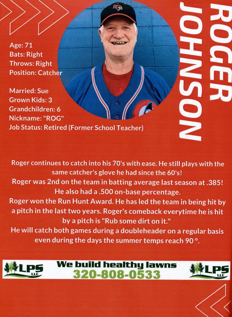 This is a story about Roger Johnson, who is now 72, and a member in good standing of the Fat Boys Walking Club. Roger is still playing baseball. He is a catcher. He travels to the Twin Cities almost every weekend where he plays multiple games, catching them all. We call him the Bionic Man (because Crazy is not polite) . . .