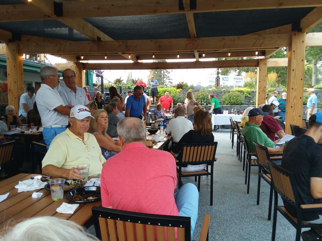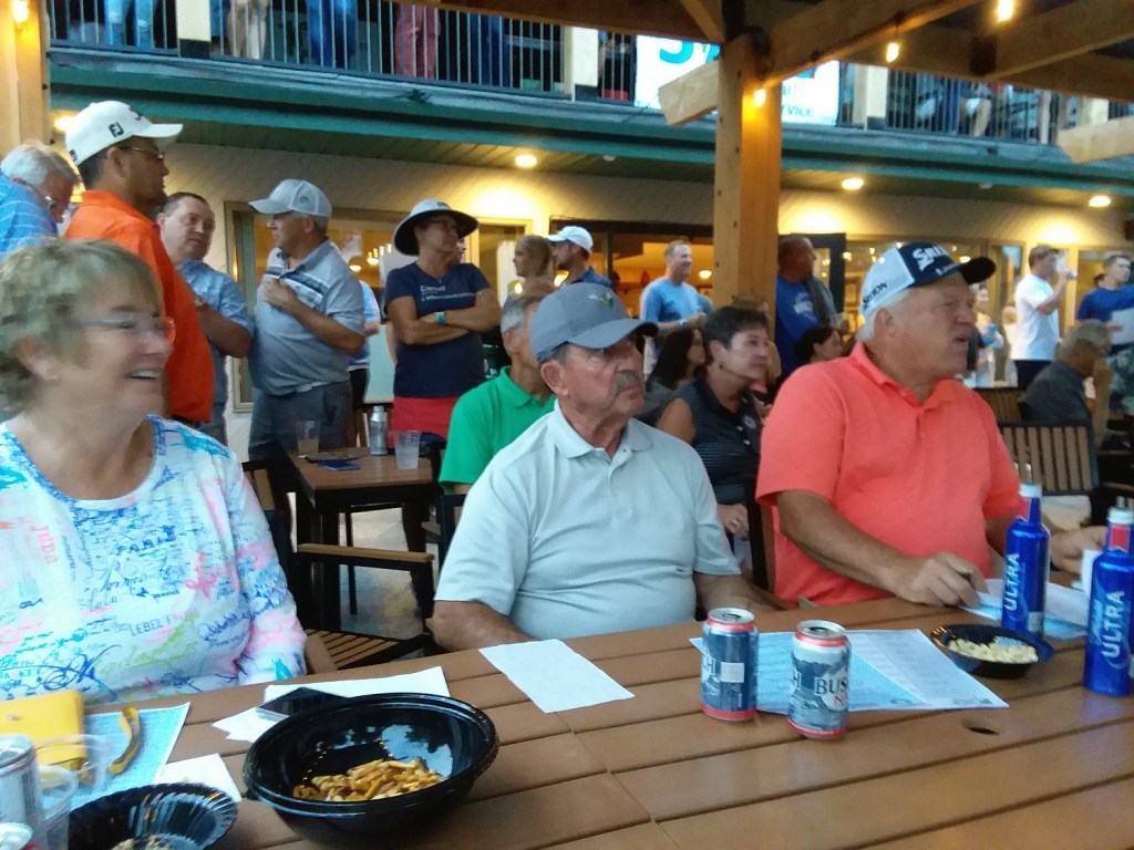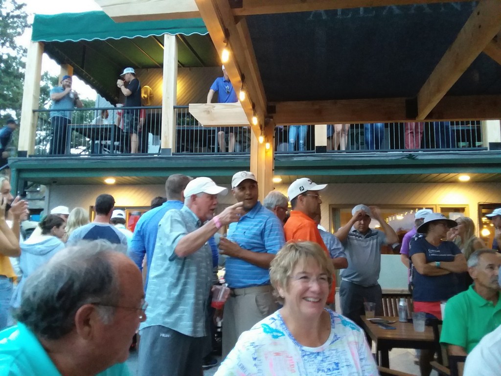 [And here are Dave and son Chris with us on the Centennial Plaza with diners and those holding Calcutta auction cards . . . ]