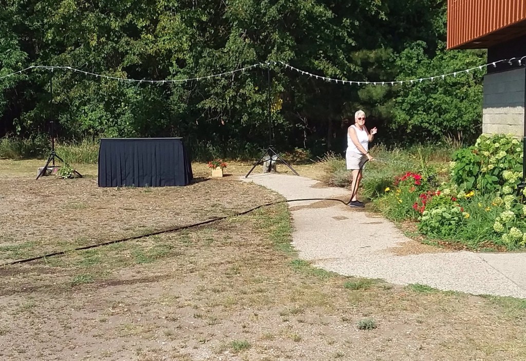 [That morning there was preparation to be done. Preparations beyond my abilities to comprehend. Nevertheless, as the temperature and dew point rapidly approached triple digits, we did what we could do. The Super and fellow board member Deb watered and weeded . . . ]