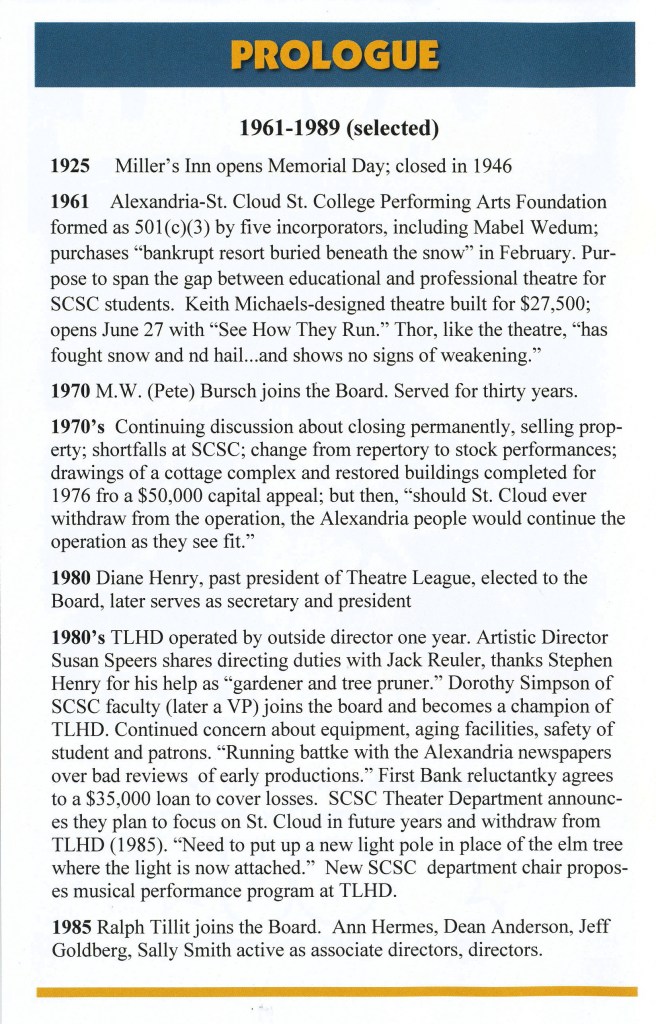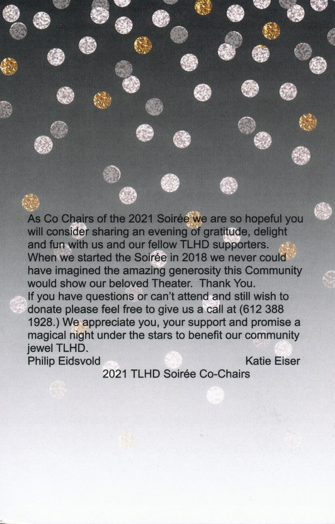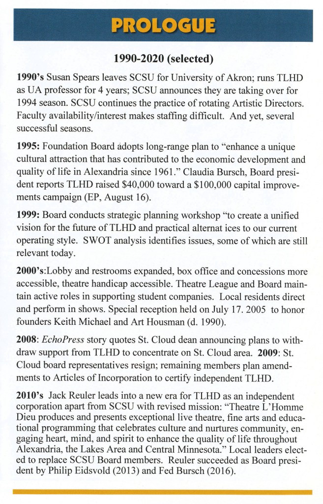 This is our annual fundraising soiree for Theatre L’Homme Dieu. Our board president, Jim Pence, has gone to every expense to publish a brief history of the theatre with a look into the future (see Playbill below). And, of course, all it takes is: “Opportunities (Let’s Make Lots of Money” (Pet Shop Boys) . . .