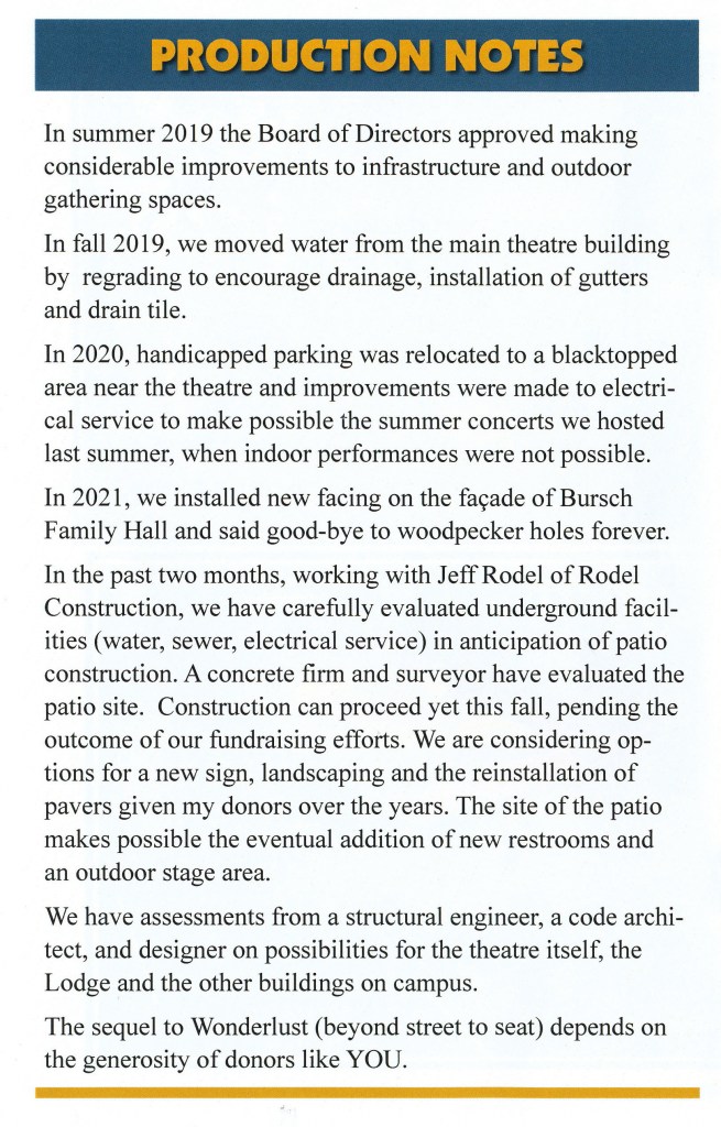 [This visual and the drought highlight our immediate fundraising needs – a patio (see the Playbill at the top) and a sprinkler system . . . ]
