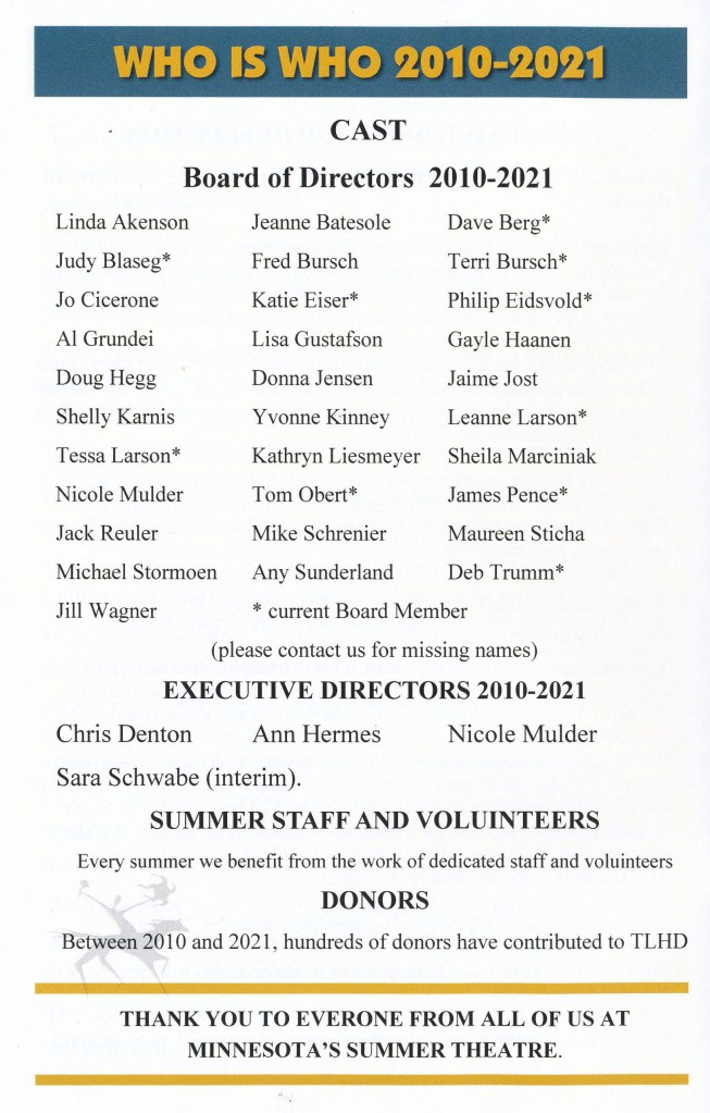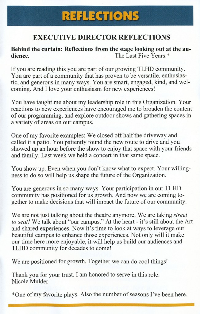 First, lead off with those responsible for all things theatre: Executive Director Nicole Mulder (center) with the crack TLHD staff (from l-r) – Sidney, Rochelle, Jenna, and Becky. A big shout out to all of you! [Contributed photo]