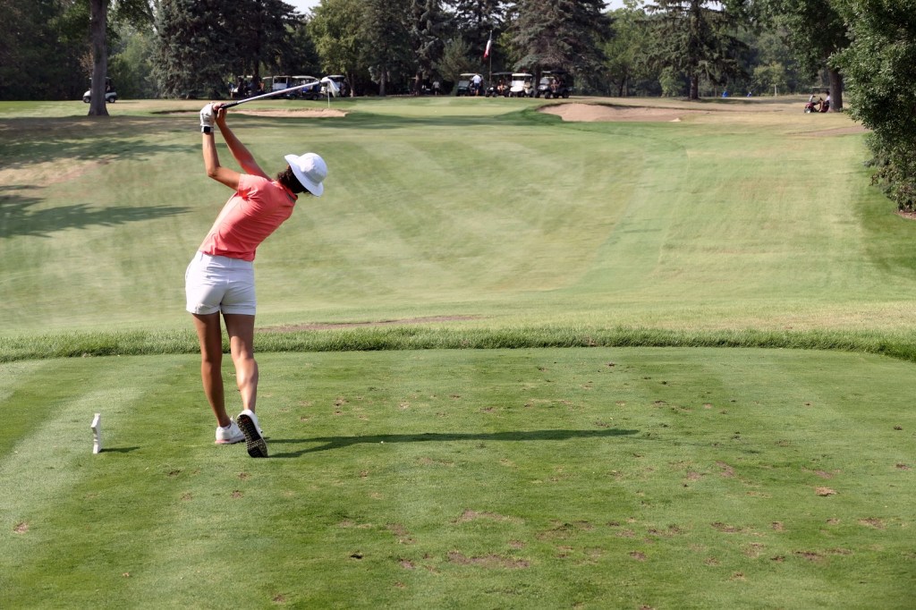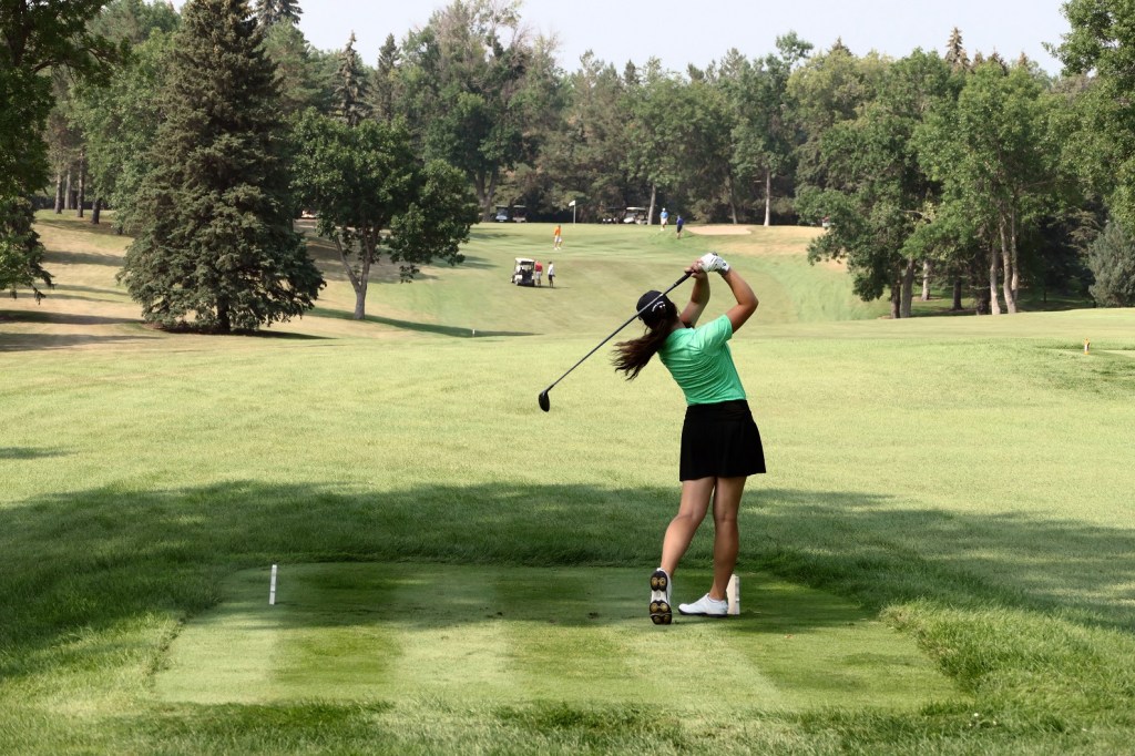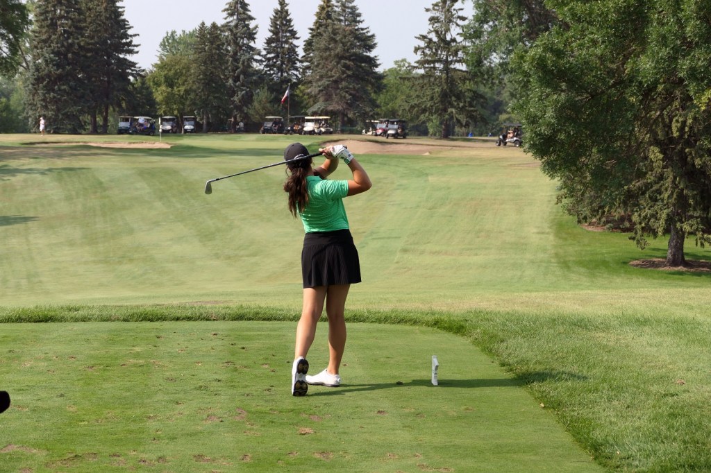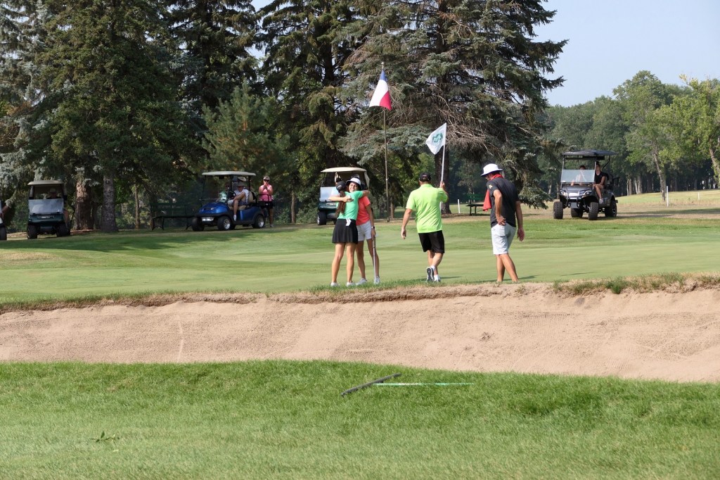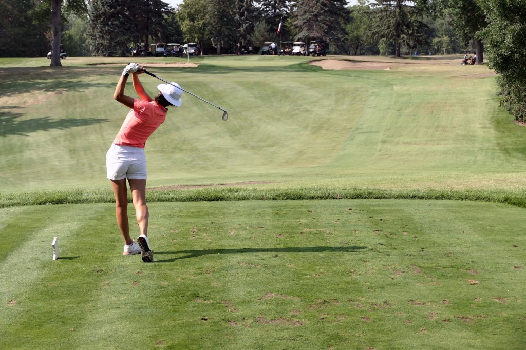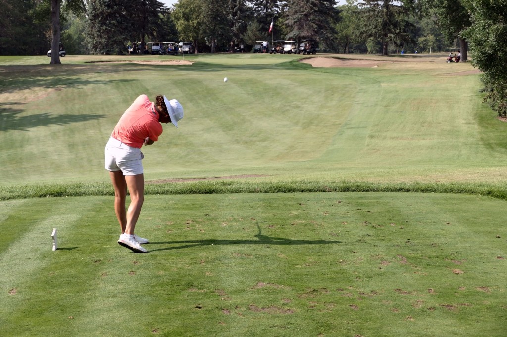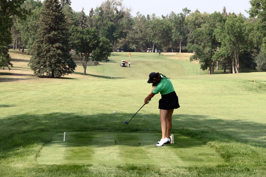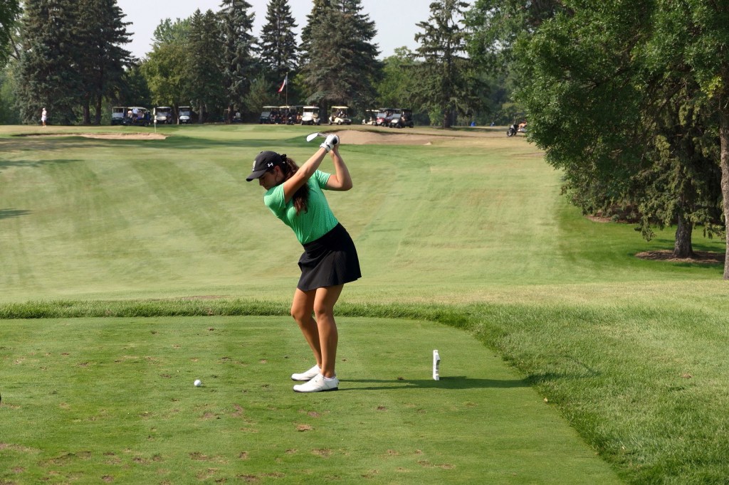 [Hole #17, par 3, Alayna hitting is currently 1-up on Ale . . . ]