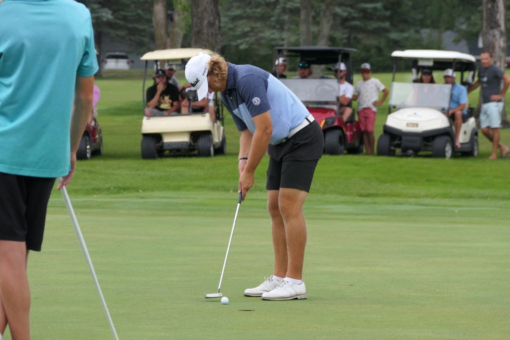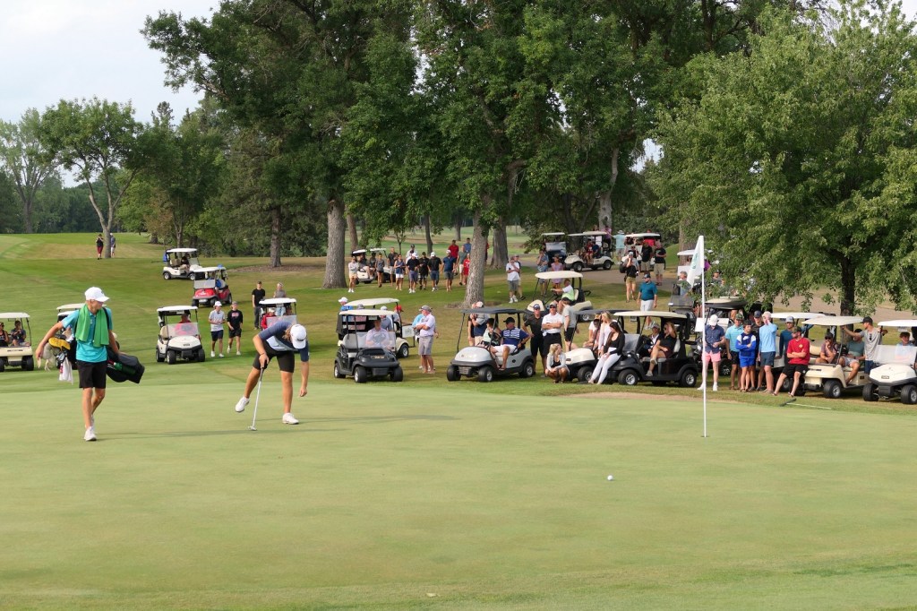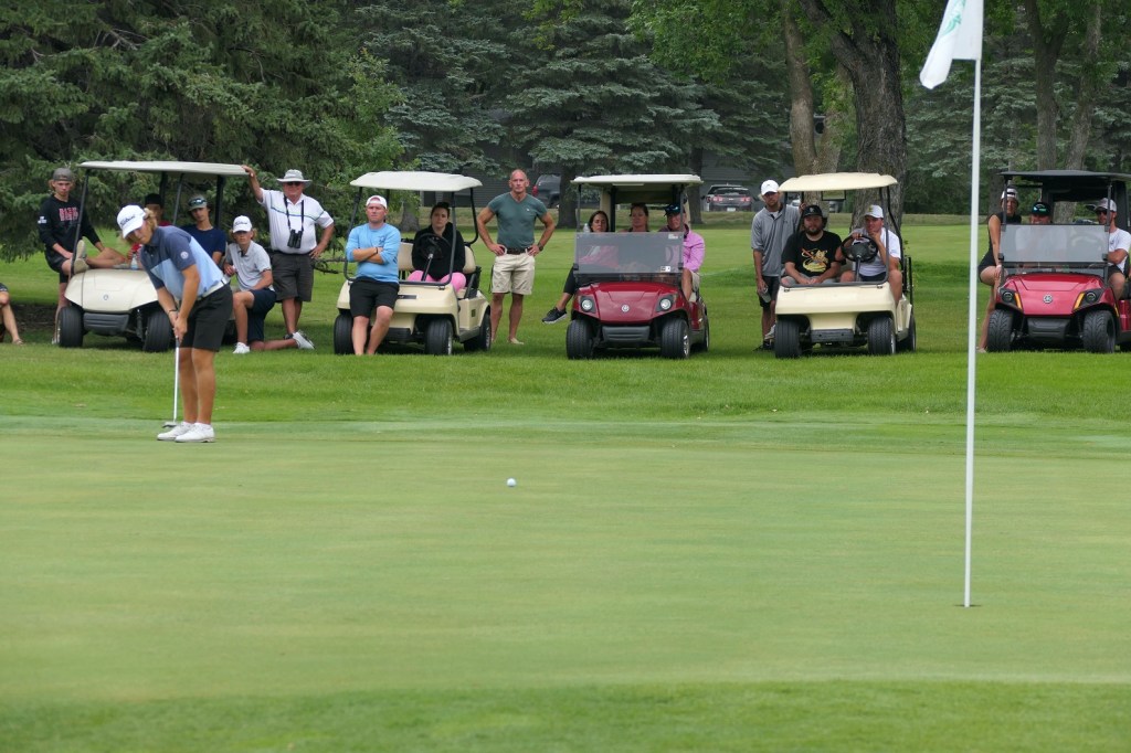 [Kelly Brown’s 2nd shot went over the green, he made a poor chip, but then sank what had to be a more than 20-foot putt for this par. Braeden then needed this putt for the halve . . . ]