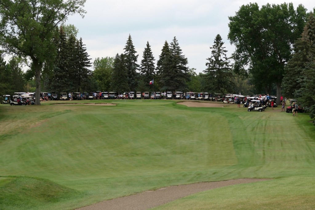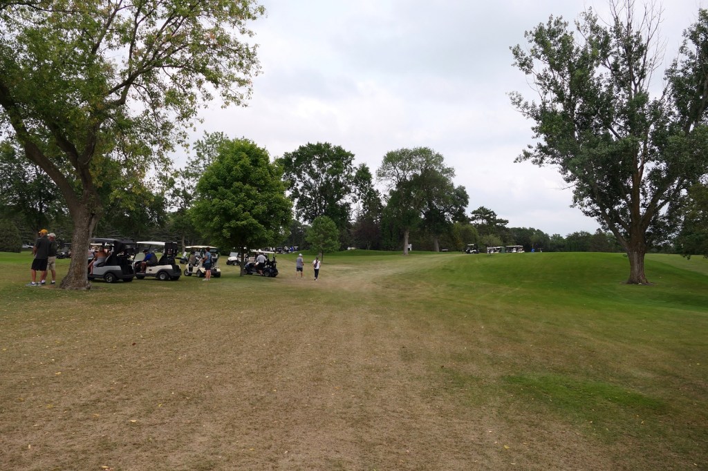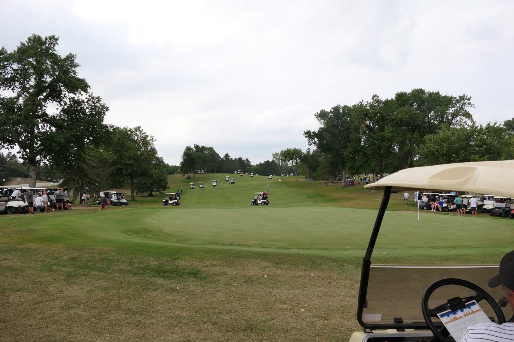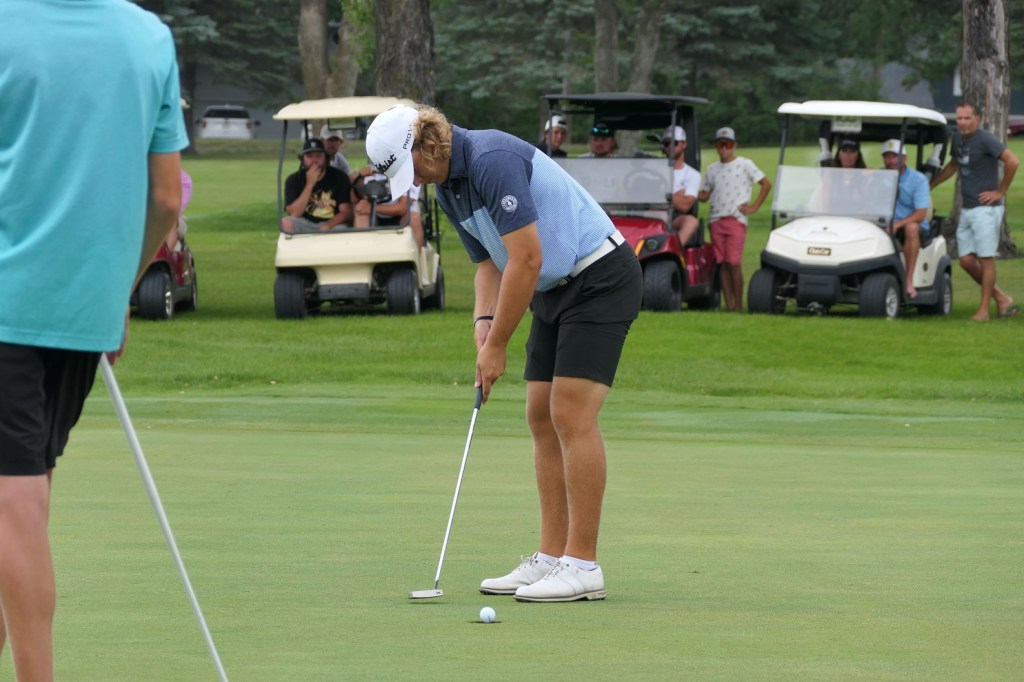 The morning of the championship rounds – men’s semi-finals and women’s final – dawned in dubious weather. There was actually some moisture around, so we opted out of golf. That afternoon, as previously reported, we had an engagement with Elsa Lee at the winery. The weather remained iffy – but with continous weather radar checks we were pretty sure we could catch the men’s championship on the back 9. Through the wonders of modern technology we were able to follow the ongoing matches. We were delighted to hear that “the kid,” Braeden Sladek, had defeated the overwhelming favorite (by Calcutta betting), Donald Constable, who won the Resorters in 2010 and then was a pro for 10 years, in the semi-final. Braeden would thus be playing for the championship, and we were off for the golf course by 4:00 . . .