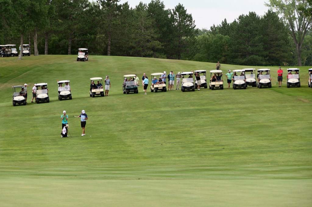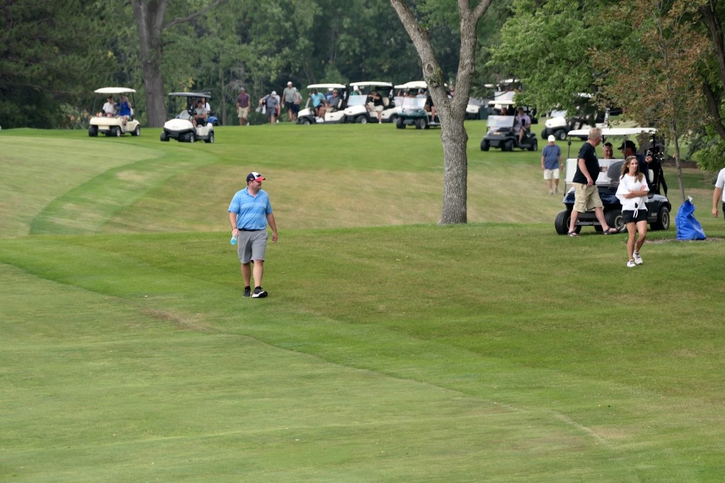 [Walking in the middle of the far fairway (14th) is Braeden and his caddy . . . ]