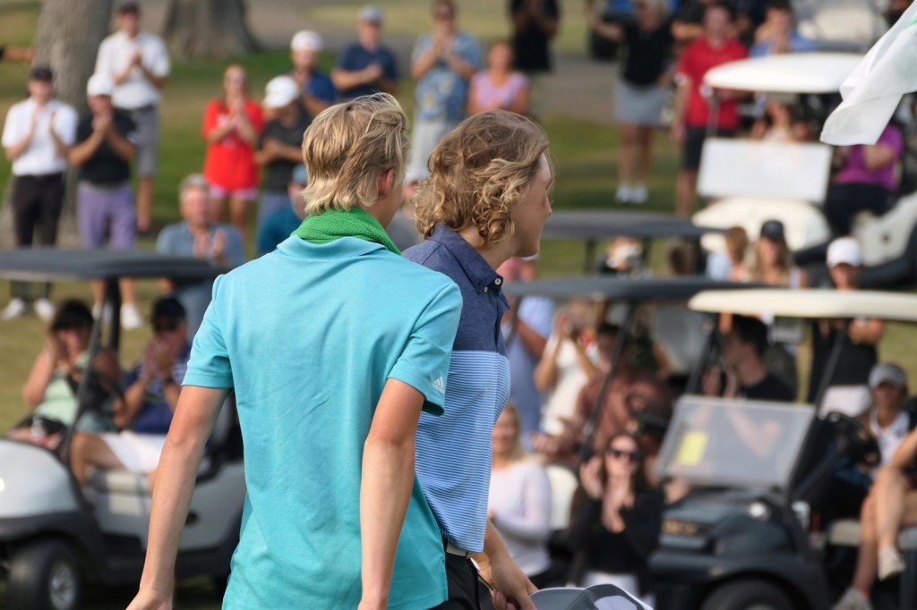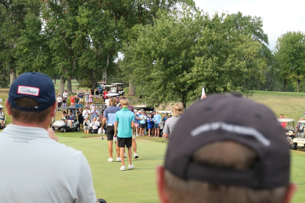 [The crowds made it hard for me to get any photos on this hole. But a roar went up from the green. Braeden won the hole with a par and went to 18 with a 1-up lead . . . ]