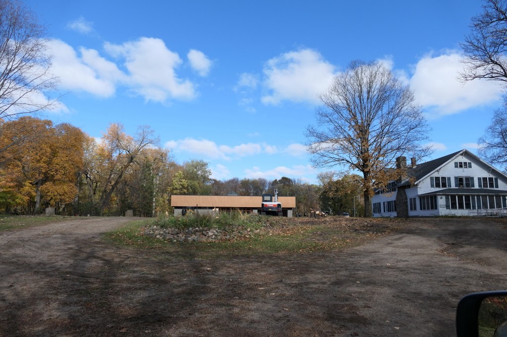[As a result of a misunderstanding occasioned regularly by our forgetfulness of detail, we appeared an hour early for the birthday party. We were told to just go take a ride. So, Ruthie, Bradley, and I hied out to Theatre L’Homme Dieu to check on the goings-on there. In less than 2 weeks many trees (many dead or dying) have been felled to make way for the future . . . ]