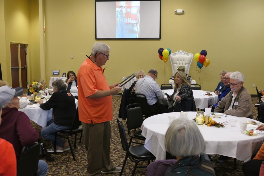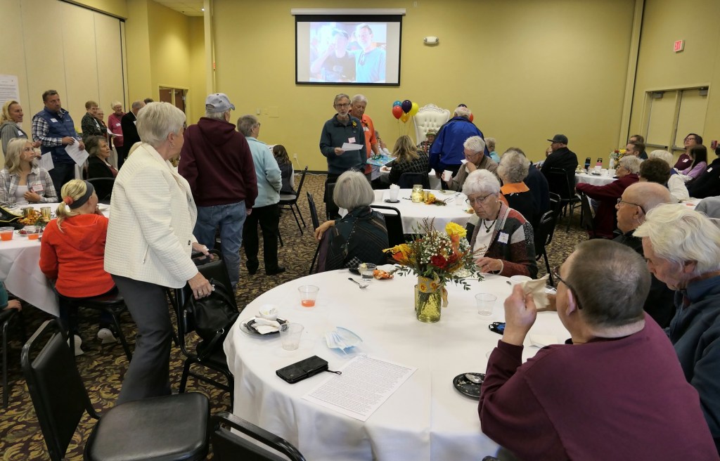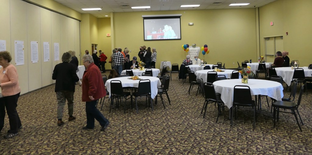 [At Big Daddy’s party venue, classmate Brad is on the left, while Ruthie visits with Merill and his oldest son, Jerry (Alex class of ’63) . . . ]