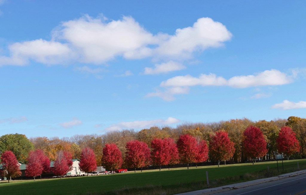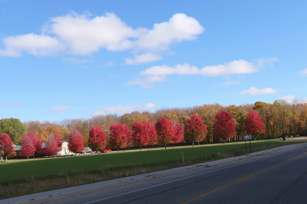 [Then we drove north on Co. Rd. 11, which was absolutely flush with color. The narrow tree lined road made stopping for photos difficult. We continued on to Co. Rd. 5, turned west to Co. Rd. 34 where we headed south toward town, past the winery where an Oktobest Festival was in full swing, and then as we approached the Lakes Darling and Carlos bridge, we came across the red maple driveway we’ve been waiting to burst out . . . ]