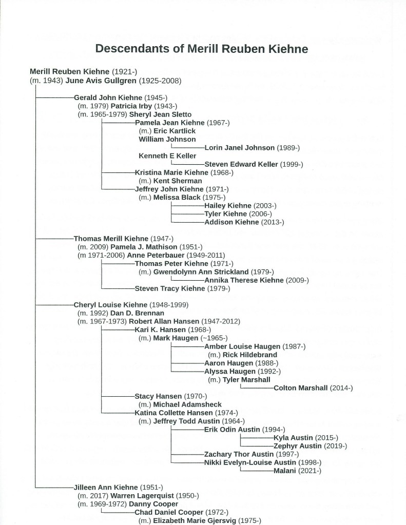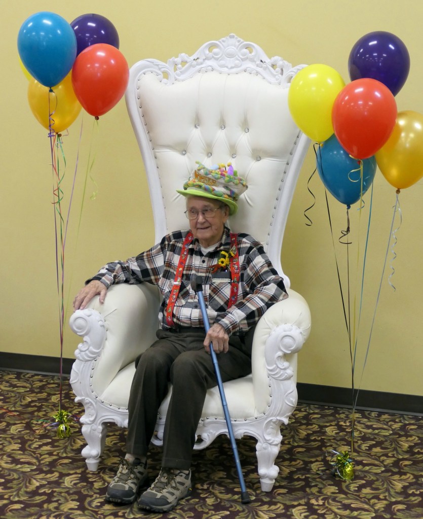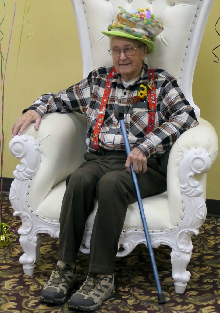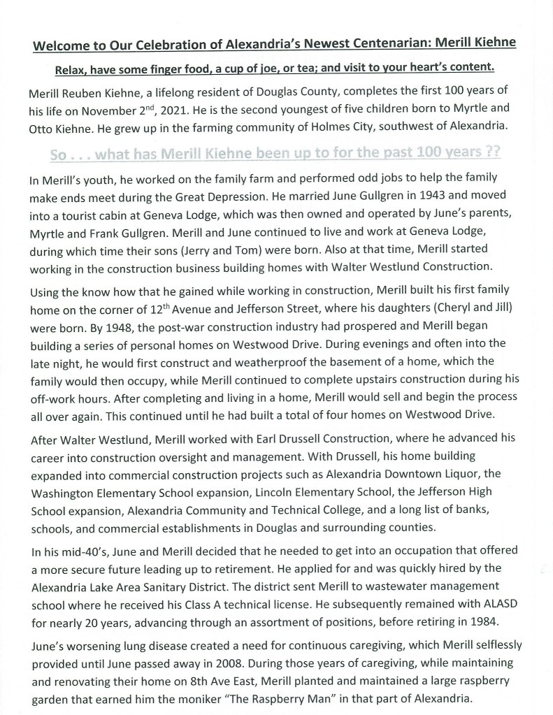 Merill is the one remaining parental unit of the four guys who hung out together during our Alexandria school years. His life story is told herein by his family. Through the years we have had a lot of fun with him – the four of us usually get together with him on his continuing run of birthdays. His next goal is 110 . . .