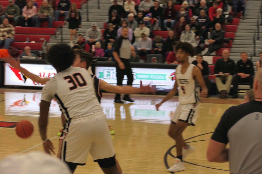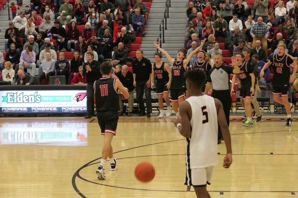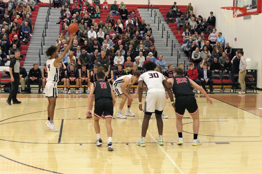 [A major Cardinal strength is depth, necessary for the all court pressing. Here Elijah Vandeveer (45), 6’4″ senior sinks a free throw . . . ]