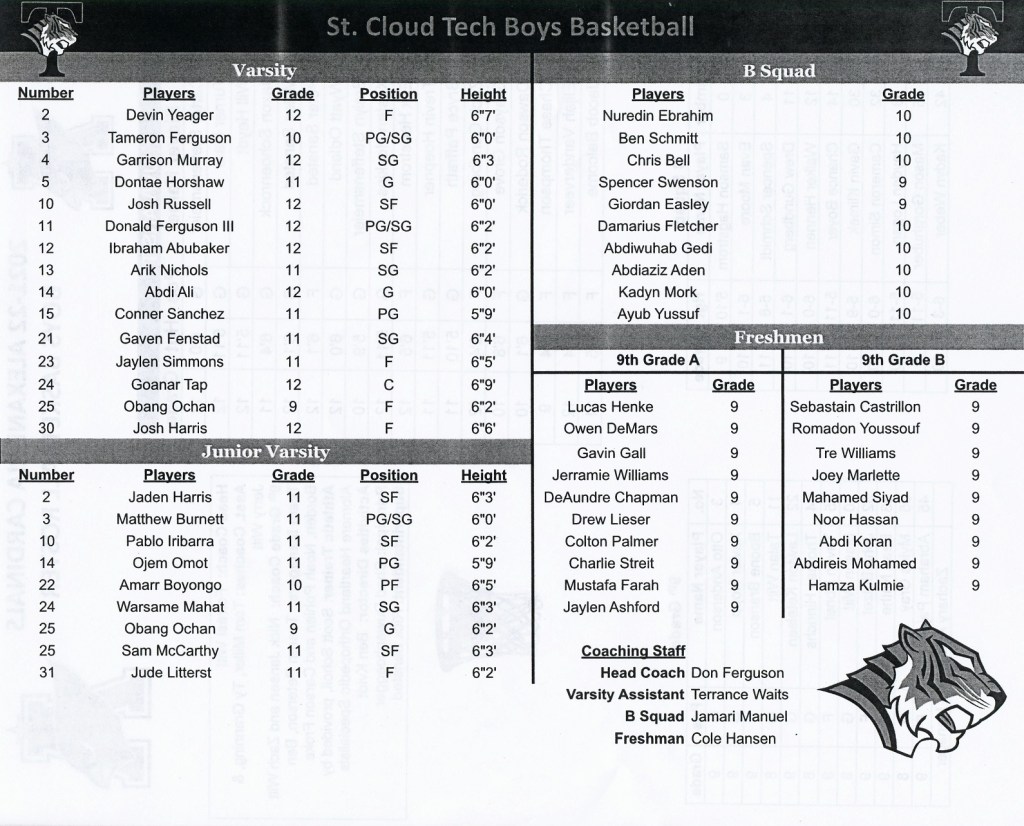 [When the Tech varsity took floor, it looked like a college team (check out the heights). Coach Witt said at season’s start that Tech and Sauk Rapids would be our stiffest conference competition . . . ]
