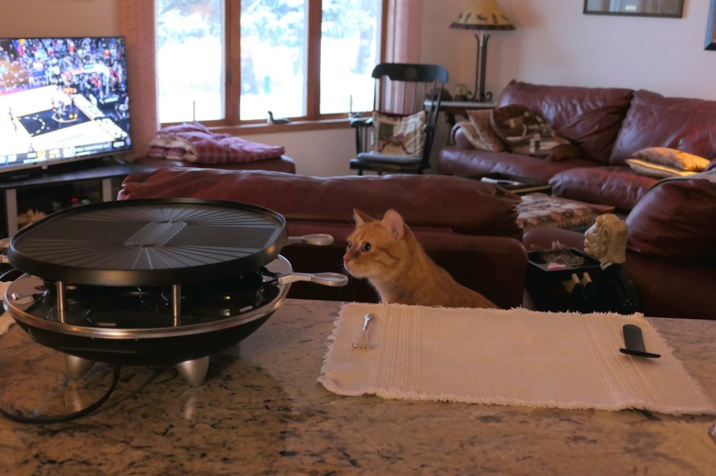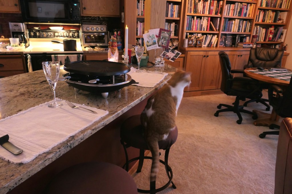 [That’s Guinie above, Laddie below. When Ruthie first put the grill on the counter, we turned our backs, and Laddie jumped up and layed down on it. Uffda! I’ve heard Raclette does not mix well with cat hair . . . ]