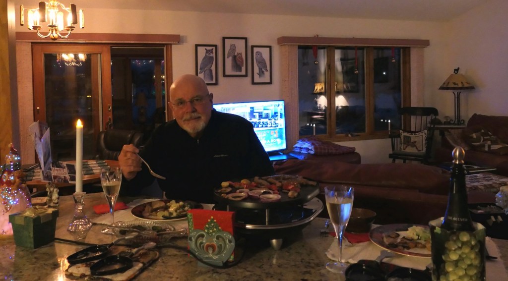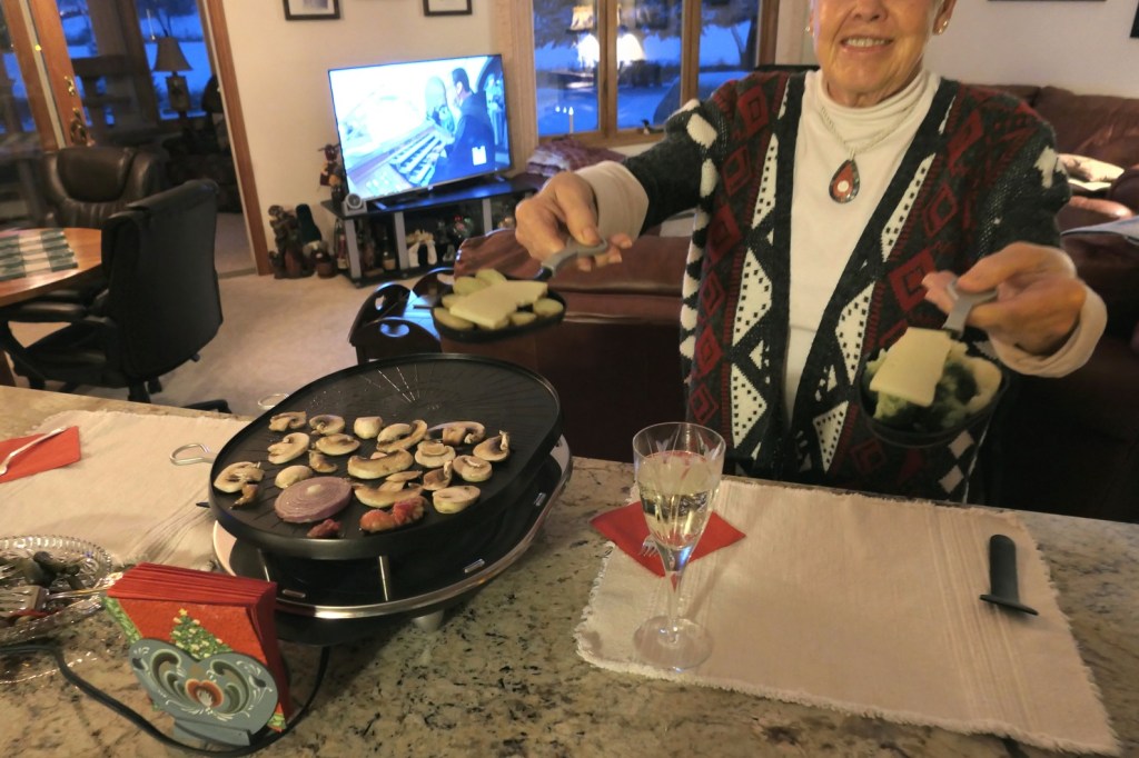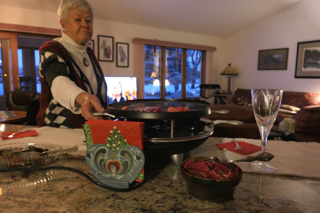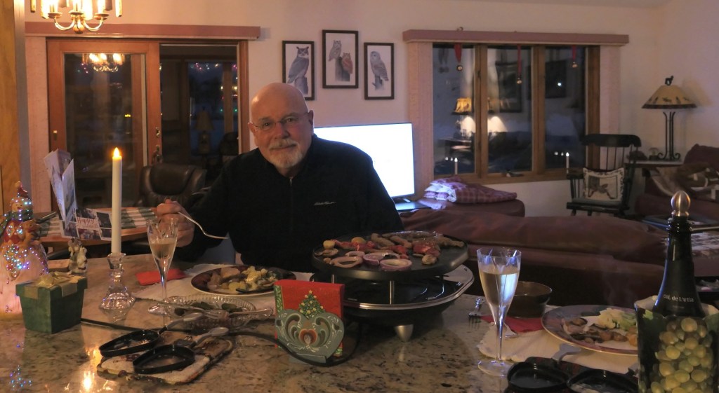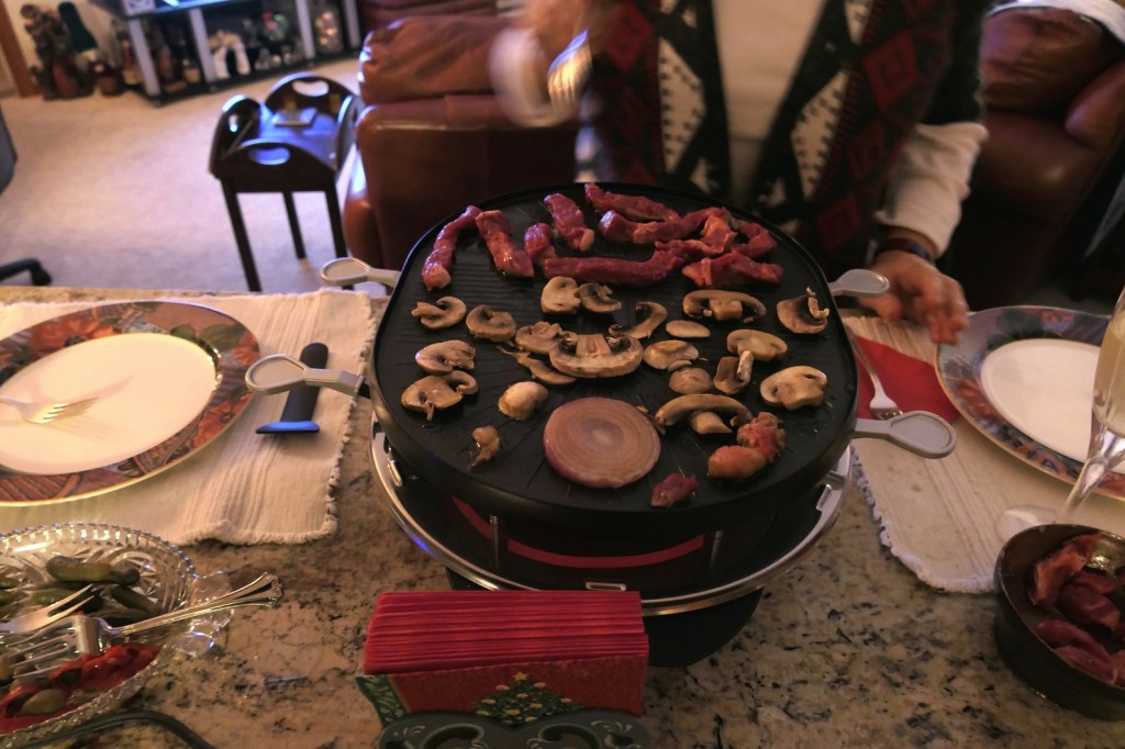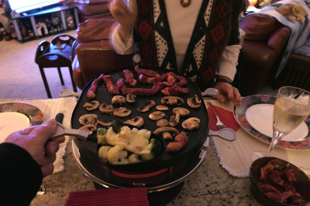 We had a Raclette Christmas dinner this year. Our first encounter with this meal took place in an alpine ski area of Europe 24 years ago. Hence, the following two photos . . .