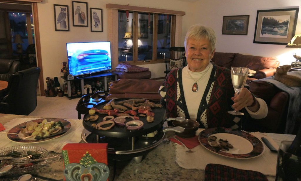 But I suspect that it was with Madame Jeannette that we experienced the marvel of a raclette dinner. “A raclette dinner party is a twist on fondue that can be a crowd-pleaser for birthdays, holidays, showers, and many other special occasions. Raclette is a type of cheese from Switzerland that is prepared with vegetables on a special grill” (thespruce.com). L-r: Roel, Michelle, Walter, Ruthie, me, with Carine in front . . .